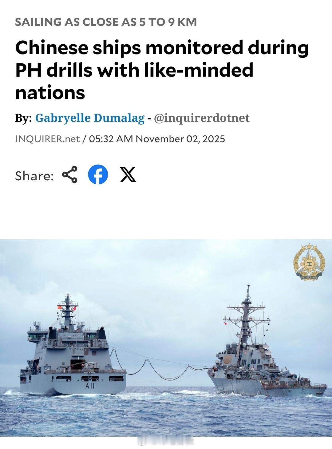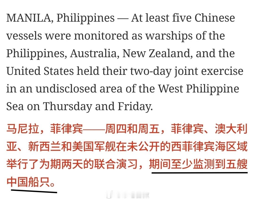 10月30日至31日,澳大利亚、新西兰、菲律宾和美国四国军队在南海举行了联合演习。然而菲律宾媒体11月2日透露,在该演习期间,周边聚集了“至少5艘不请自来的中国海军舰艇”,比参演的四国舰队规模还大。