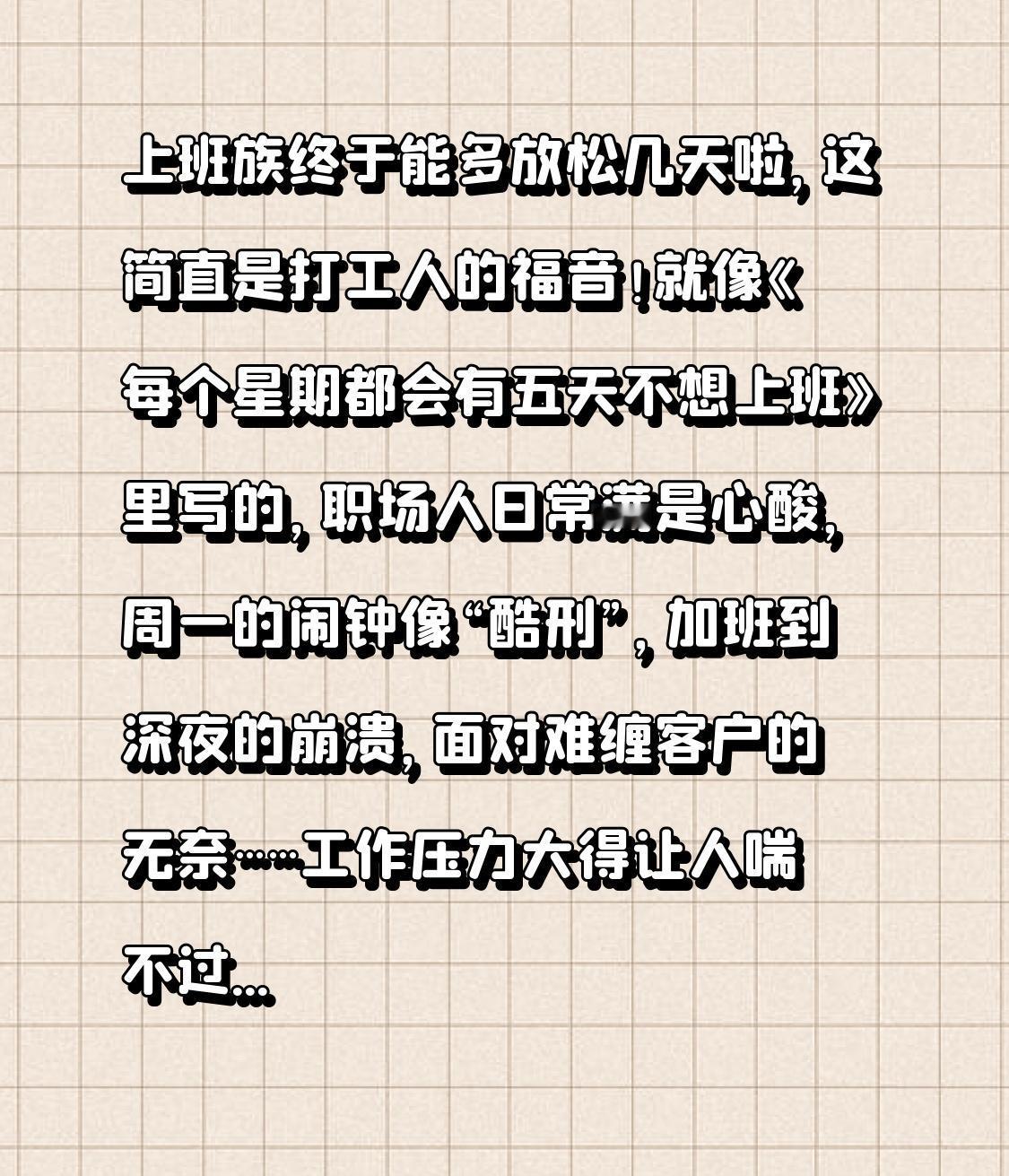 上班族终于能多放松几天啦,这简直是打工人的福音!就像《每个星期都会有五天不想上班》里写的,职场人日常满是心酸,周一的闹钟像“酷刑”,加班到深夜的崩溃,面对难缠客户的无奈……工作压力大得让人喘不过气。 有调查显示,一周中周四工作效率最低,周一很多人有“星期一综合征”,80%的人周一起床后情绪低落。所以上班族太需要多些放松时间了。可以学学书里“摸鱼式解压”,和“不想上班”的情绪和平共处,把生活节奏放慢点,毕竟工作只是谋生手段,不是生活的全部。