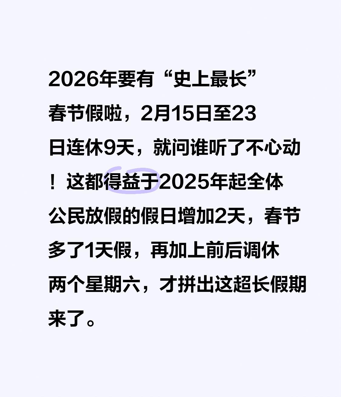 2026年要有“史上最长”春节假啦,2月15日至23日连休9天,就问谁听了不心动
