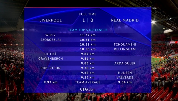直播吧11月05日讯利物浦本轮欧冠1-0击败皇马。赛后官方跑动数据出炉。