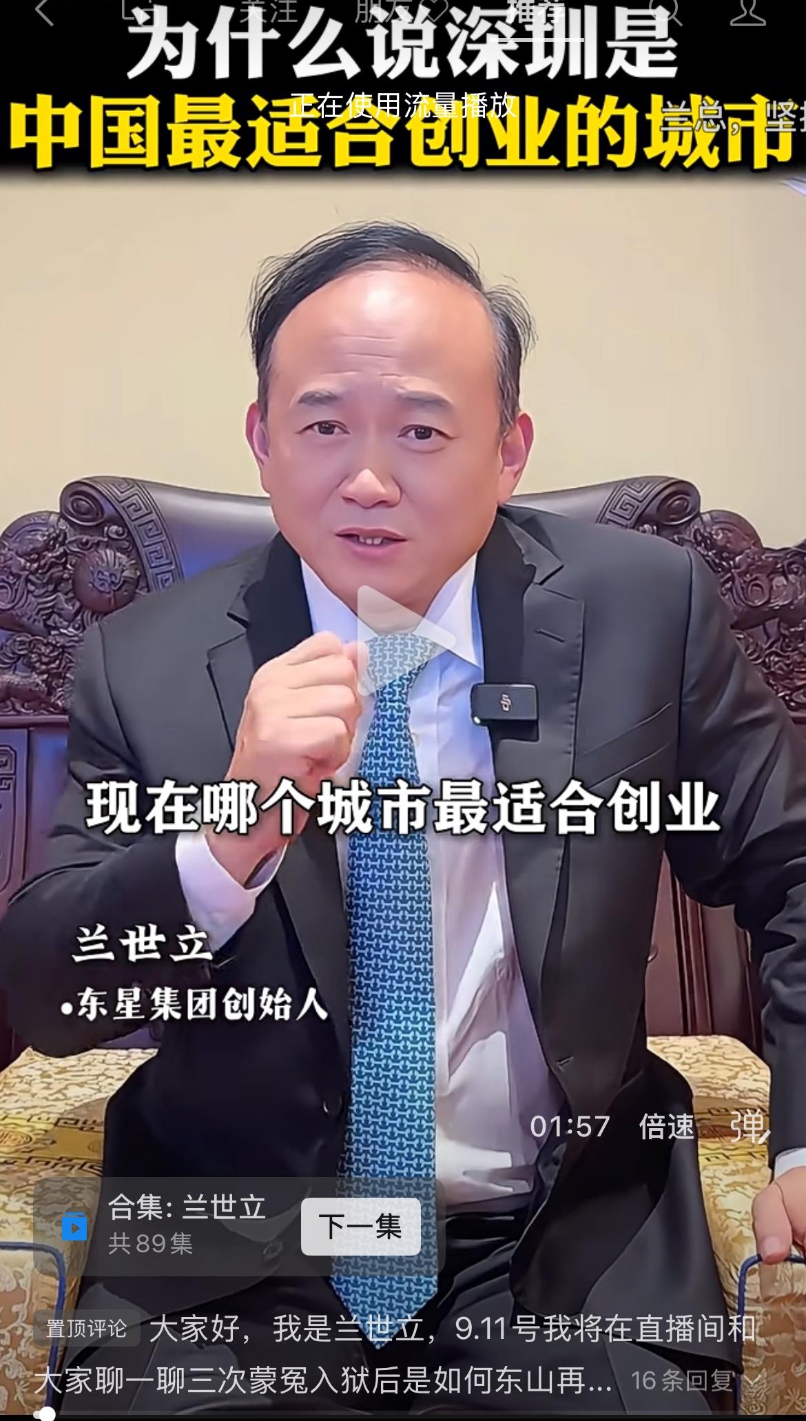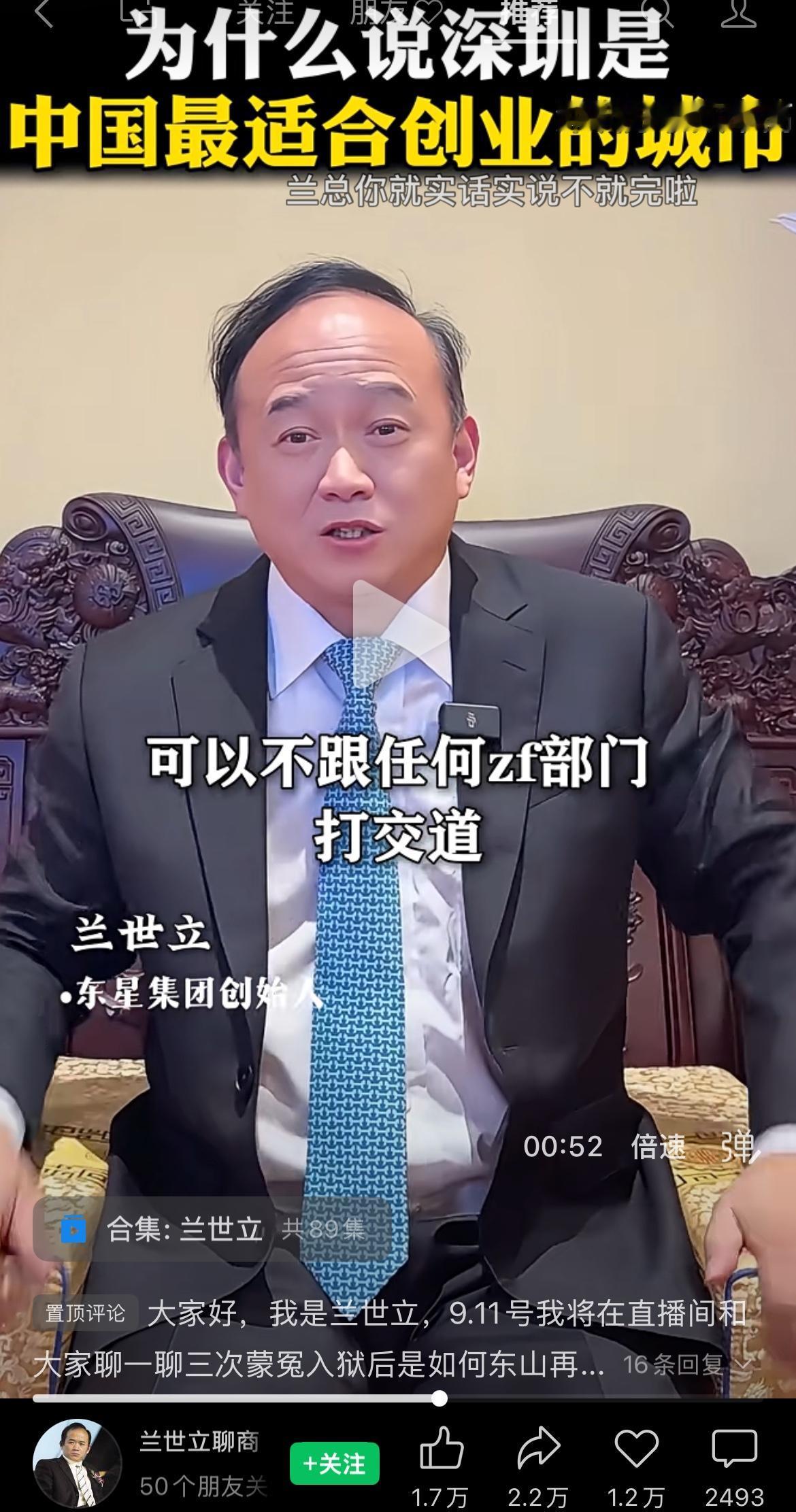 湖北前首富,著名企业家兰世立:深圳是中国最适合创业的城市。 兰世立最近谈到了创业,兰总表示,自己在很多国家和城市都生活过; 但最后他发现,只有深圳是最适合创业的城市。 他高度赞扬了深圳的创业基因和环境。 1、毫不犹豫告诉你,深圳是最适合创业的地方; 2、最初选择了武汉创业,在北京,上海,广州都呆了很长时间; 还在泰国,香港,新加坡生活了好多年; 3、这一次重新创业选择了深圳呢? 因为深圳有创业基因。 4、你想去北京上海广州创业,不要说创业,生存都很困难。 5、其他城市的生存成本并不低,创业成本却很高; 6、深圳创业,可以不跟任何ZF部门打交道,其他城市行吗? 7、深圳聚集了全球最好的人才,资源和技术; 8、兰总还透露,他在深圳两次创业,赚得盆满钵满, 这次再次回到深圳创业,非常有亲切感,创业一定要来深圳。 兰总这次是要搞什么高科技的创业呢,希望能东山再起吧。
