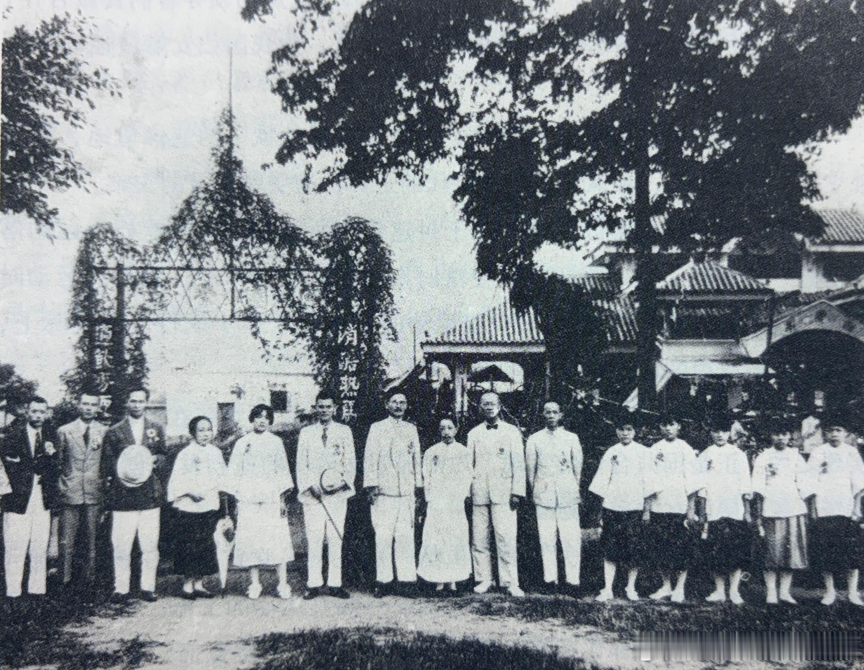 1924年9月13日中秋节黄埔军校党代表廖仲恺(左八)、国民党中央党部妇女部部长何香凝(左四)应邀参加建国粤军第二师师长兼第四旅旅长及两广盐务局缉私主任张民达(左六)与邓淑贤(左五)婚礼时与师参谋长叶剑英(左二)、第二师舰队陆战队总指挥邓文烈(左七)、国民党广东支部长邓泽如(左九)合影历史影像