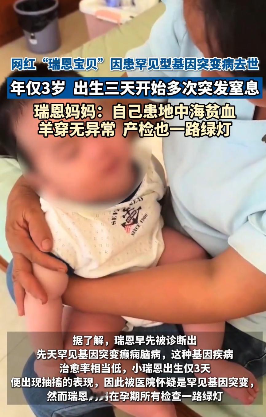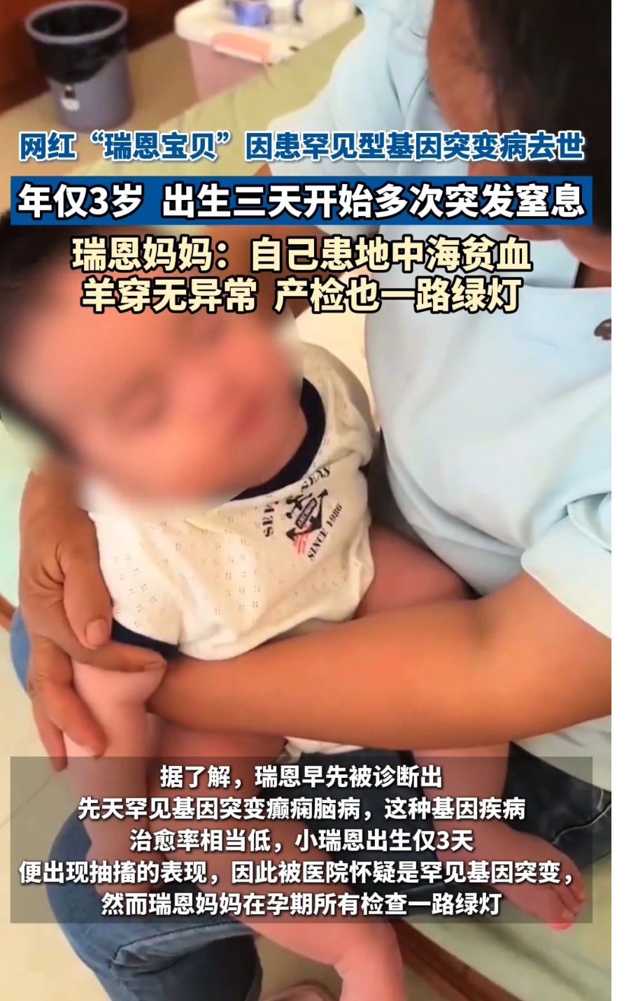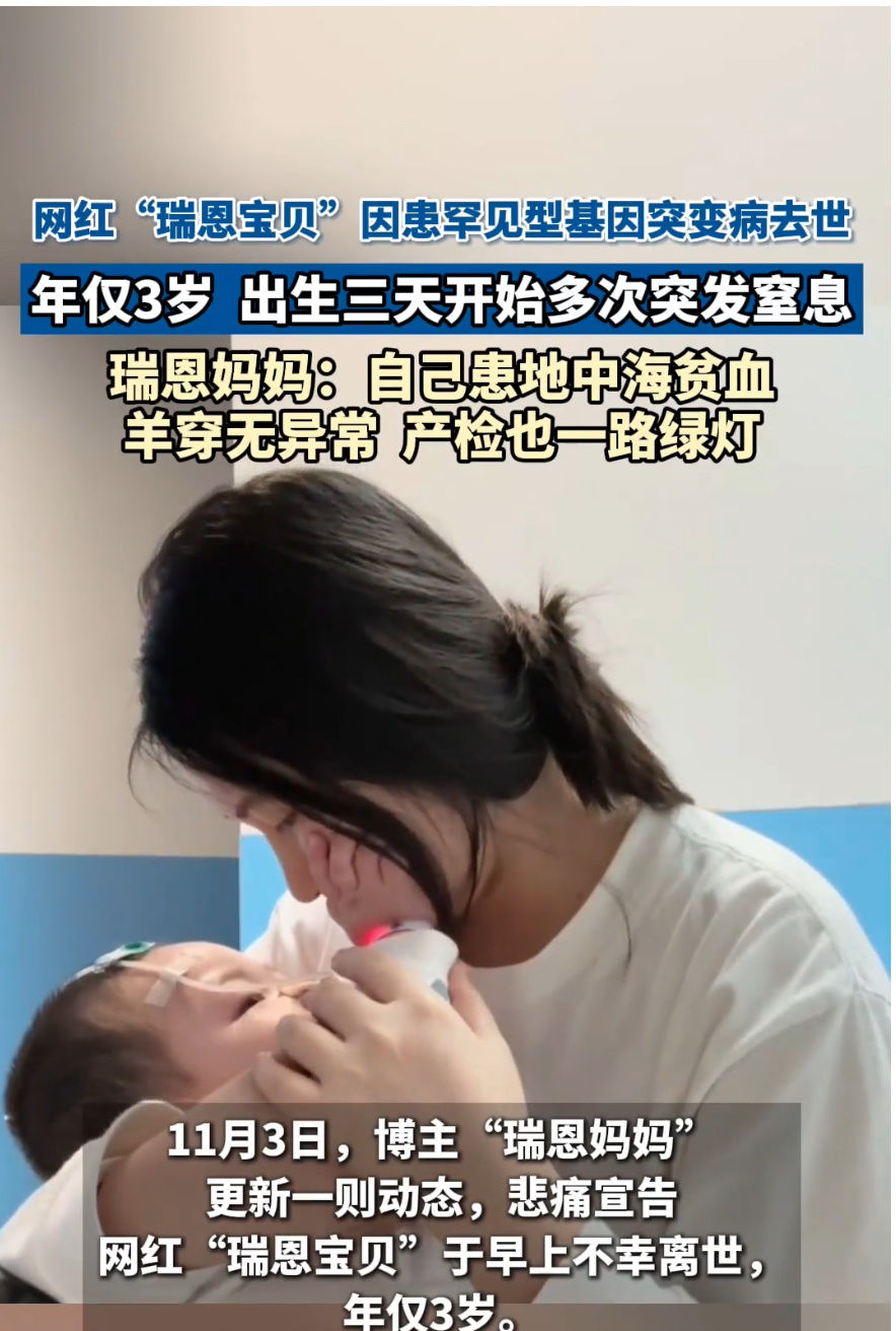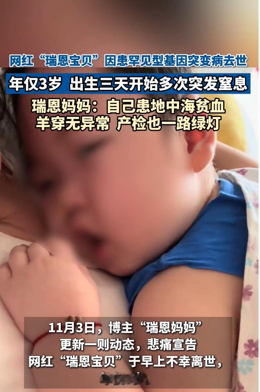 网红瑞恩宝贝去世年仅3岁3岁的“瑞恩宝贝”终究没熬过,和罕见基因突变引发的癫痫抗争3年,他的世界满是治疗与呼吸机。97年的单亲妈妈带着地贫,用短视频记下“阳光照不到的地方有妈妈”,这份坚韧让13万网友牵挂。