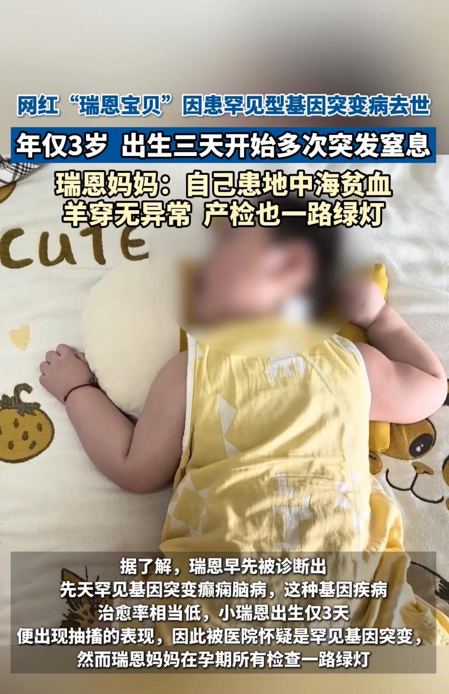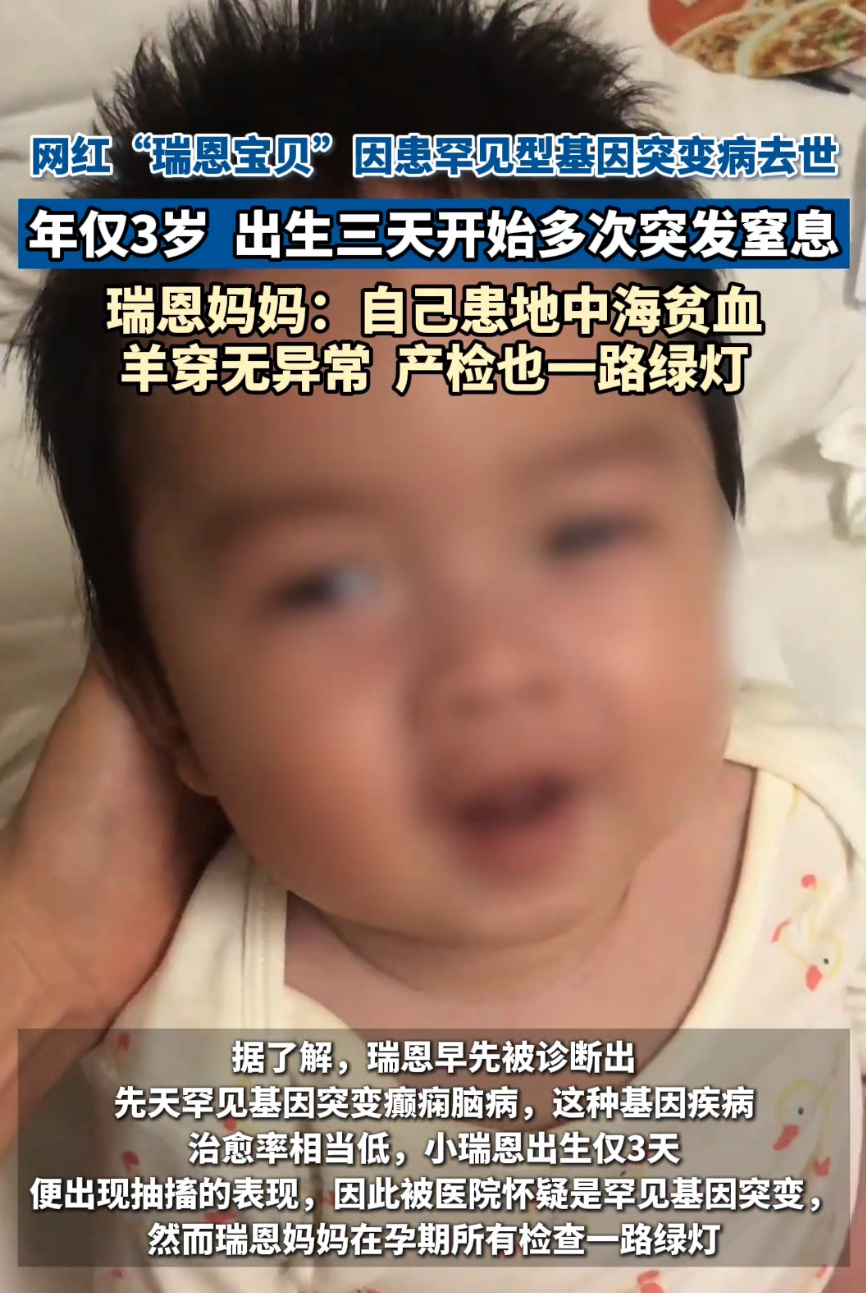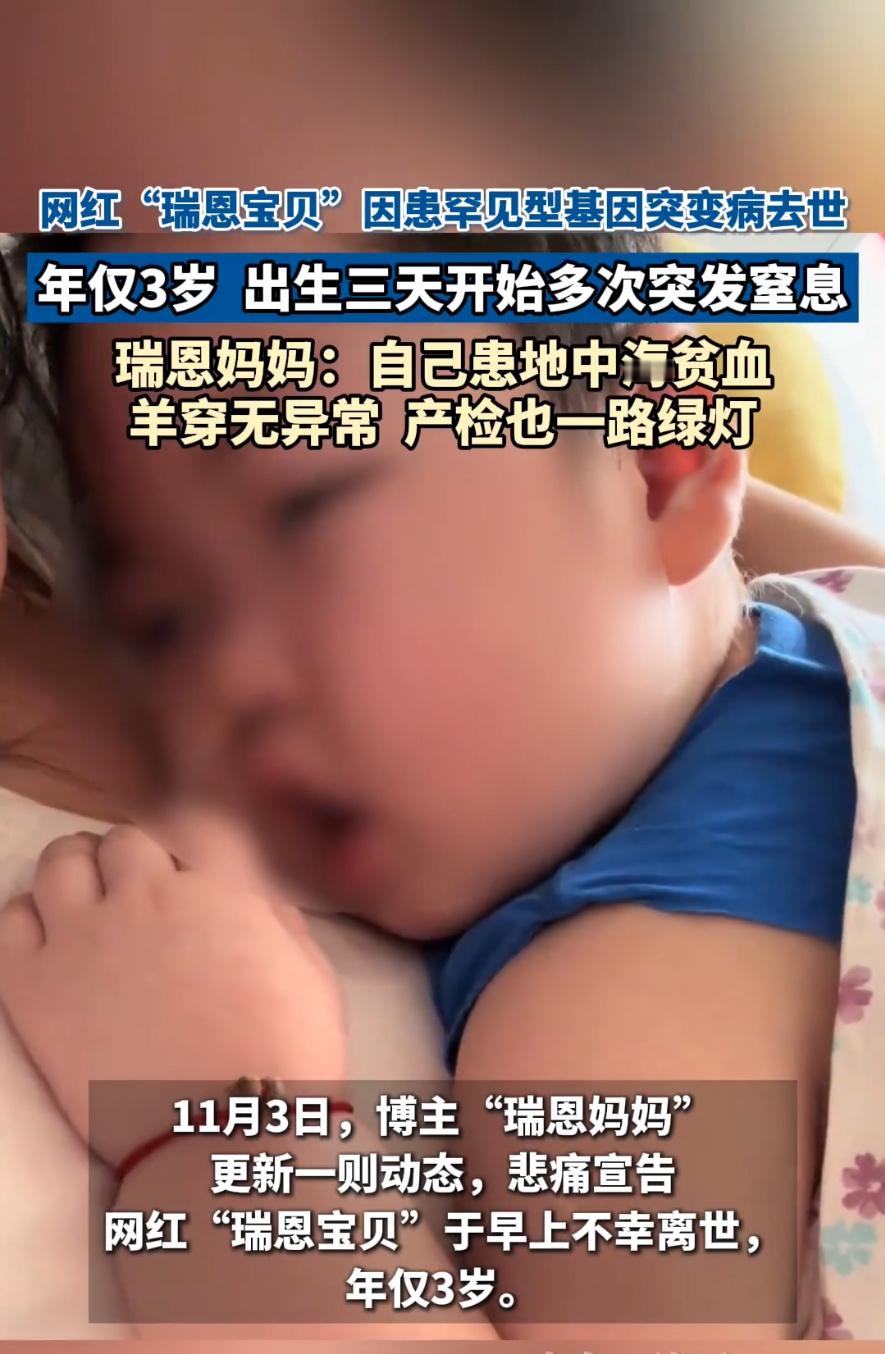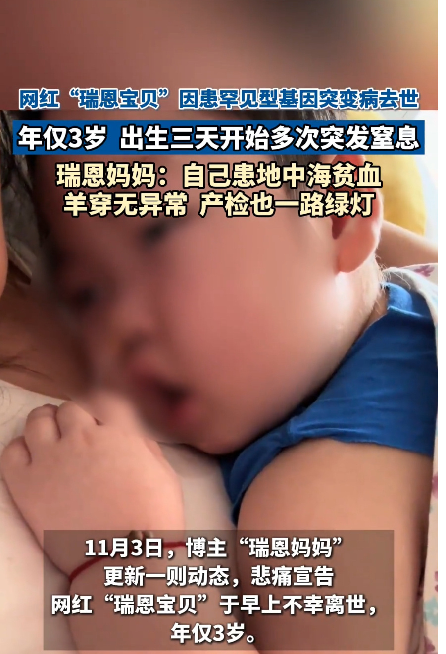 网红瑞恩宝贝去世年仅3岁3岁的“瑞恩宝贝”终究没熬过,和罕见基因突变引发的癫痫抗争3年,他的世界满是治疗与呼吸机。97年的单亲妈妈带着地贫,用短视频记下“阳光照不到的地方有妈妈”,这份坚韧让13万网友牵挂。
