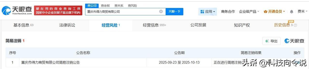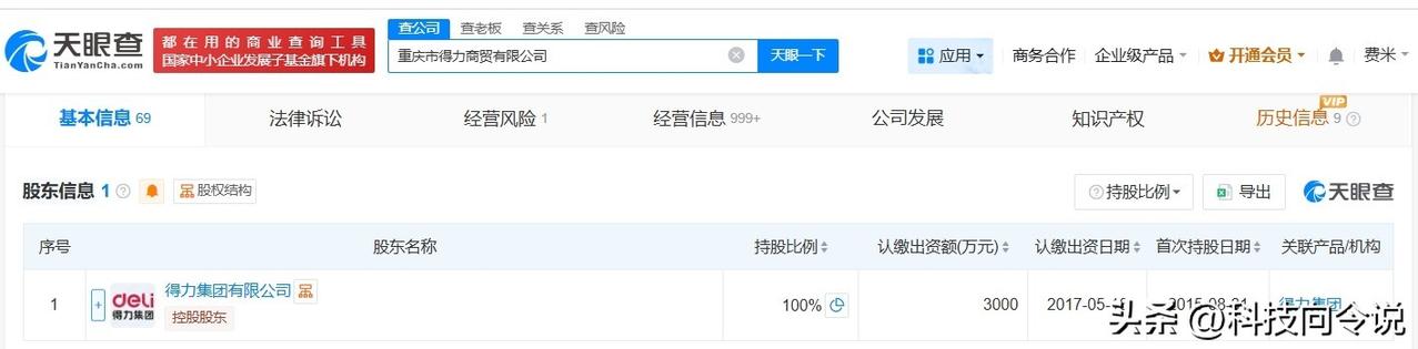 【得力集团旗下重庆商贸公司注销】 天眼查工商信息显示,近日,重庆市得力商贸有限公司登记状态由存续变更为注销。此前,该公司已发布简易注销公告。 重庆市得力商贸有限公司成立于2015年8月,法定代表人为黄胜全,注册资本3000万人民币,经营范围包括办公用品销售、机械设备租赁、办公设备租赁服务等。股东信息显示,该公司由得力集团有限公司全资持股。 天眼查信息: