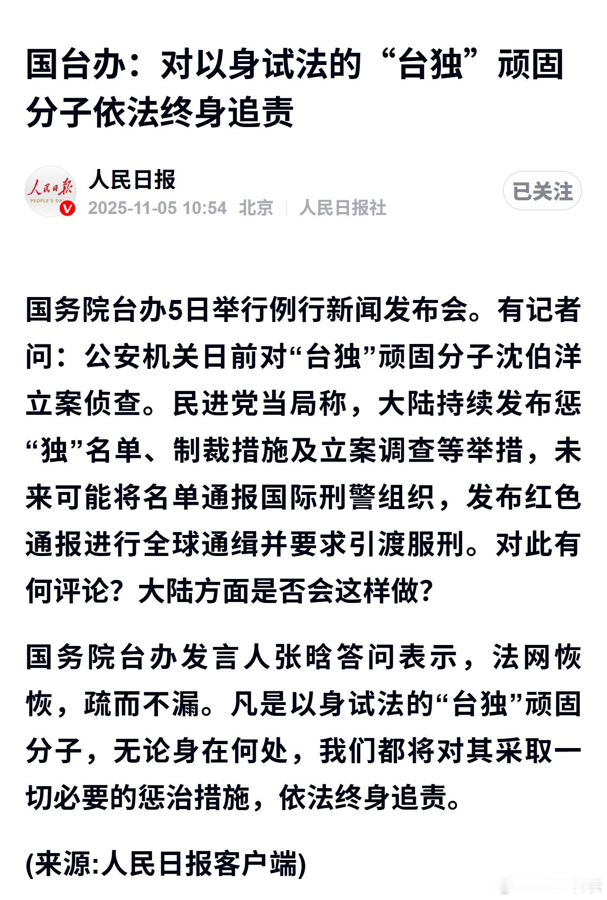 国台办:对以身试法的“台独”顽固分子依法终身追责
