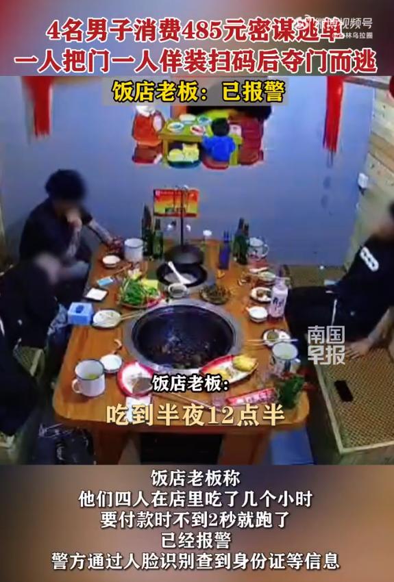 “必须严惩!”11月1日,河南鹤壁,两位小伙带着两个女孩来到一家餐馆吃饭,4个人一共消费了200多元,谁知最后要付款时,4个人却互相打掩护逃单!店主追出去100多米,没想到这4个人却骑得飞快逃走,网友:小小年纪就学会这些了? 11月1日晚上,河南鹤壁一家餐馆里,两男两女凑成一桌吃得正香,桌上的饭菜加起来消费了两百多块。 这几位年轻人点菜的时候挺有礼貌,用餐过程中也没什么异常,可等到该结账的时候,一套精心设计的“逃单戏码”就上演了。 监控拍得清清楚楚,快吃完时这四人就开始频繁交头接耳,还时不时往店主那边张望。没过多久,其中一男一女先借故走出了店门,留下的另一对男女立刻开始配合。 小伙子假装喝多了,跑到店外的树旁扶着树干“狂吐”,一下子就把店主的注意力吸引了过去。 而同行的女孩早已经骑上电动车,在路边一辆车后面藏着接应。 就在店主分心的那一瞬间,小伙子撒腿就跑,飞快地跳上电动车,两人一脚油门就窜了出去。 店主反应过来后一边喊着“付钱”一边追,足足追了一百多米,最终只能看着他们的背影越来越远。 事后店主说,看这几个人年纪都不大,真没想到会干出这种事,现在还盼着他们能主动回来把账结了。 两百多块钱算不上多大的数目,却足以看清一个人的品行,这种提前分工、互相打掩护的逃单,比临时起意的耍赖更让人不齿。 无独有偶,就在鹤壁这起事件的第二天,也就是11月2号的凌晨,吉林吉林市的一家铁锅炖店里,也发生了一起几乎如出一辙的逃单事件。 当天半夜十二点左右,四名男子在这家铁锅炖消费了四百八十五元。 从监控里能看到,这几个人在包间里就开始密谋,还专门分了工。 两个人先提前离开,剩下的两人里,一人负责在门口“把风”,另一人则拿着手机假装扫码付款,一边操作一边慢慢往门外挪。 等店主没注意的时候,假装付款的男子立刻加快脚步,和把门的同伴一起夺门而逃,坐上早就等候的车辆消失了。 这次店主没追出去,直接就报了警,他说这种有预谋的逃单,根本不是“忘了付钱”那么简单。 这两起事件摆在一起,能看出不少相同的地方。 涉事者都是年轻人,都是多人结伴聚餐,更关键的是,他们都不是临时起意,而是提前分工、默契配合,把逃单做成了一场“配合默契的表演”。 更让人唏嘘的是,他们花在琢磨逃单技巧上的心思,要是用在正事儿上,恐怕都能做成不少事。 这些年轻人敢这么明目张胆地逃单,说到底还是法律意识和责任意识太淡薄。 他们可能觉得,两百多、四百多块钱数额不大,就算被发现了也没什么大不了,却不知道这种故意逃避支付餐费的行为,已经违反了治安管理处罚法。。 就算没到追究法律责任的程度,这种失信行为也会给个人信誉留下污点,影响以后的生活。 餐饮行业里,这样的年轻人逃单事件并不少见,有从业十年的餐厅经理说,每年都能遇到好几起。 店主们损失的不光是几百块餐费,调取监控、报警处理都要耗费大量时间和精力,到最后可能还得自己吃亏。 也难怪越来越多的商家开始采取预防措施,有的预收押金,有的加派服务人员,还有的会在客人离店时主动送出去,既是服务也是提醒。 要改变这种状况,关键还是得加强教育。家庭和学校要多培养年轻人的诚信意识,让他们明白,做人最基本的底线就是讲信用,不能为了一点小便宜就丢了人品。 社会也要多宣传相关的法律知识,让年轻人清楚逃单的后果,知道这种“小聪明”其实是会吃大亏的。 说到底,两百多块钱买不来一顿心安理得的饭,却能买走一个人的诚信。 那些为了省点餐费就耍花样逃单的年轻人,丢的不仅仅是钱,更是做人的尊严和未来的信誉,这笔账怎么算都不划算。