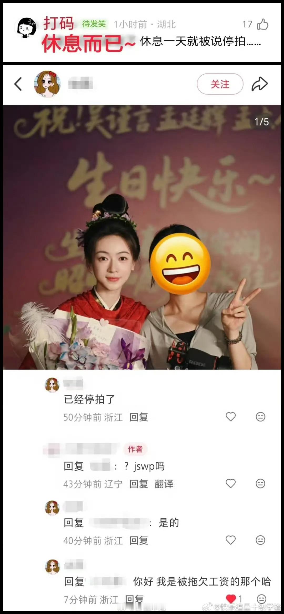 有群演爆料吴谨言、陈哲远主演的《江山为聘》剧组欠薪和停拍了。