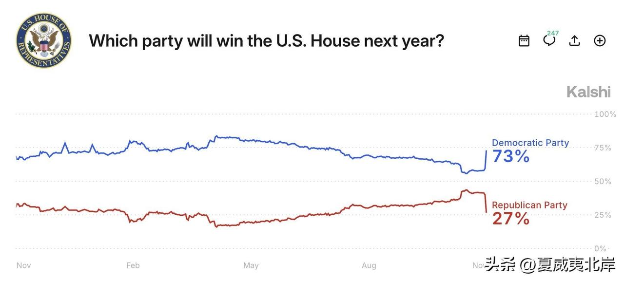 在选举夜实现横扫之后,民主党明年成为参议院多数党的概率飙升,拉升了15%至73%。