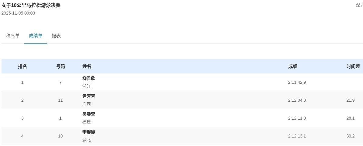 三届全运会冠军辛鑫哪去了?柳妈夺冠。 今天上午,第十五届全运会的女子10公里马拉松游泳决赛结束,浙江队的柳雅欣以2分11秒42夺得冠军。 令人意外的是,在此之前连续夺得该项目三届全运会冠军、中国第一个夺得该项目世锦赛冠军(2019年)的辛鑫没有出现,她哪去了? 三届全运会冠军,跨度是12年啊,而辛鑫今年还只有29岁。 据查询,她前三届全运会的夺冠成绩都远优于今天柳雅欣的夺冠成绩,2024年拿到了世锦赛第37名,成绩为2分4秒21,巴黎奥运会第24名,成绩是2分27秒02。而且之前有报道她在备战本届全运会,怎么44人的比赛没有了她?