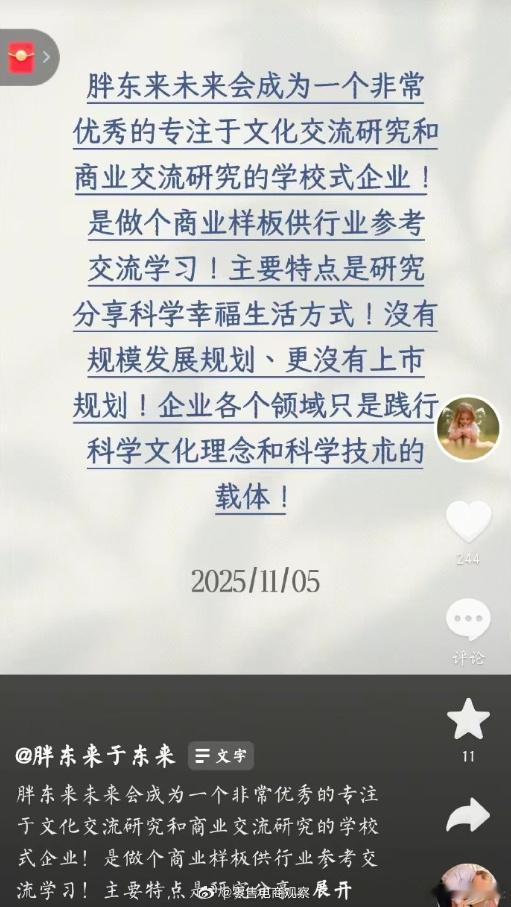 【于东来称胖东来无上市规划】11月5日,于东来在社交平台发布图文称,胖东来没有规模发展规划、更没有上市规划。于东来称,胖东来未来会成为一个专注于文化交流研究和商业交流研究的学校式企业,是做个商业样板供行业参考交流学习。