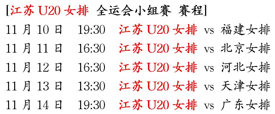 全运会|江苏U20女排小组赛赛程 第十五届全运会江苏U20女排小组赛赛程: 11月10日19:30江苏-福建 11月11日16:30江苏-北京(蒋丽微,丁欣妍) 11月12日16:30江苏-河北 11月13日13:30江苏-天津(朱航霆,李荣钰) 11月14日19:30江苏-广东 第十五届全运会U20女排小组赛中,江苏女排将面对连战强敌的紧密赛程。五场比赛中,北京女排拥有蒋丽微与丁欣妍等参加了排超联赛A级比赛的球员;而天津队则由朱航霆、李荣钰领衔,整体实力强劲,攻防转换速度快,是小组中最具竞争力的对手之一。其余场次包括福建、河北与广东,均不容小觑。祝福江苏女排取得佳绩!