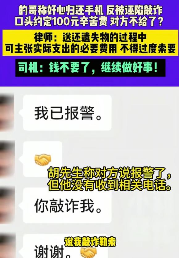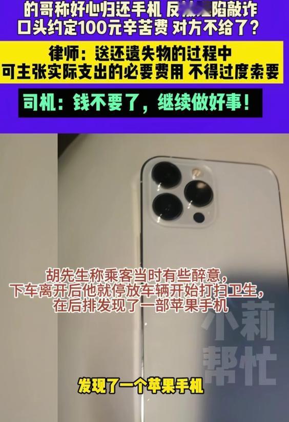 “寒了好人的心!”河南郑州,男子开出租车拉了2个乘客,乘客下车后,男子在后座发现一部苹果手机,他好不容易联系上乘客,乘客让他第2天送过去,口头说好给男子100块辛苦费,不料,男子开车送去后,乘客拿走手机,加上男子微信就走了,那100块钱非但没给,反过头却说男子敲诈。 2025年10月25日晚间,郑州出租车司机胡师傅结束了一单生意,将两名带着明显醉意的乘客送到目的地。 按照惯例,他拉开后座车门准备清理卫生,避免影响下一位乘客的体验,就在这时,一部白色苹果手机映入眼帘,显然是刚下车的乘客遗落的。 胡师傅第一反应就是尽快归还失主,可这是路边接的乘客,没有通过平台下单,他手里没有任何联系方式。 焦急中,他想起乘客付款时用的是微信,立刻翻出付款记录,在后台留言“你遗失了物品”。 消息发出后迟迟没有回应,胡师傅没敢走远,在原地等候了几分钟,见仍无动静,考虑到营运车辆不能长时间停运,才继续接客。 直到后来,失主终于回复了消息,提出让胡师傅第二天把手机送过去,还说会拿出100元做出对他的补偿。 第二天一早,胡师傅特意暂停了正常营运,专程开车将手机送到约定地点。 失主接过手机后,提出要添加胡师傅的微信,胡师傅见对方言辞恳切,便没再多问,转身就去继续接客了。 可他等到深夜十二点,微信里始终没有转账提示,无奈之下发了条的消息,对方却迟迟不回复。 更让胡师傅心寒的是,对方终于回复时,发来的竟是“我报警了,你敲诈我”这样的文字。 胡师傅瞬间懵了,自己好心好意送还手机,怎么就成了敲诈? 他等了一整天,也没接到警方的任何联系电话,这才明白对方是在故意诬陷。 委屈的胡师傅找到记者求助,记者联系上当时与失主同行的乘客。 那位同行乘客表示,当时曾让胡师傅拐回来交接,可胡师傅没同意。 对此胡师傅解释,发现手机时他确实在原地等过,后来联系上时正拉着客,无法临时取消订单,只能约定次日送还,并非故意拒绝交接。 面对解释,同行乘客只说“你们俩联系吧,我这会正忙”,便没了下文。 最终,胡师傅看着那句“敲诈”的留言,无奈地说钱他不要了,只是这事堵在心里太难受。 类似的纠纷并非个例,2023年1月也发生过一起。网约车司机李先生捡到乘客卜女士的手机,卜女士主动提出给100元报酬请他送还。 可李先生送到后,卜女士却以定位显示绕路为由拒付,还质疑其敲诈。 好在李先生提前录了音,证明对方确实承诺过付费,经民警调解,卜女士最终兑现了承诺。 这两起事件里,100元都只是司机的合理成本补偿。 对失主而言,手机本身价值数千元,里面的个人资料更是无法用金钱衡量,司机提出的补偿远低于其受益价值。 更关键的是,胡师傅和李先生都主动联系失主并专程送还,全程没有任何占有的意图,所谓“敲诈”根本无从谈起。 失主临时反悔不兑现承诺已属不妥,反过来诬陷好人更是恶劣。 这种行为伤害的不仅是当事司机的感情,更可能让更多人在捡到失物时犹豫退缩。 毕竟,没人愿意让自己的善意被践踏,让好心落得被诬陷的下场。 别让承诺变成空话,别让诬陷寒了善心,这才是对善意最基本的尊重。
