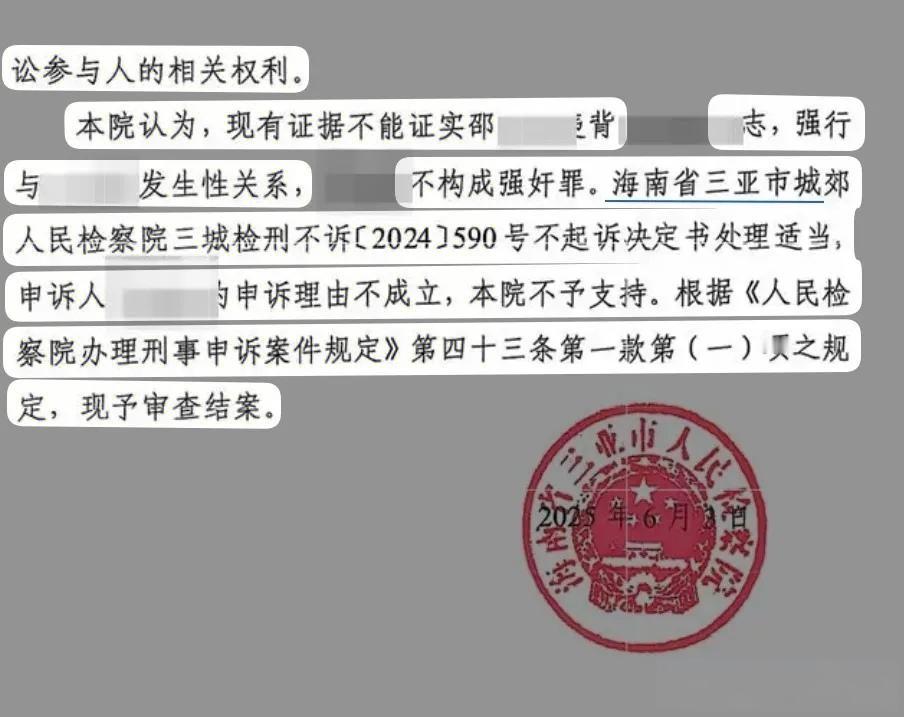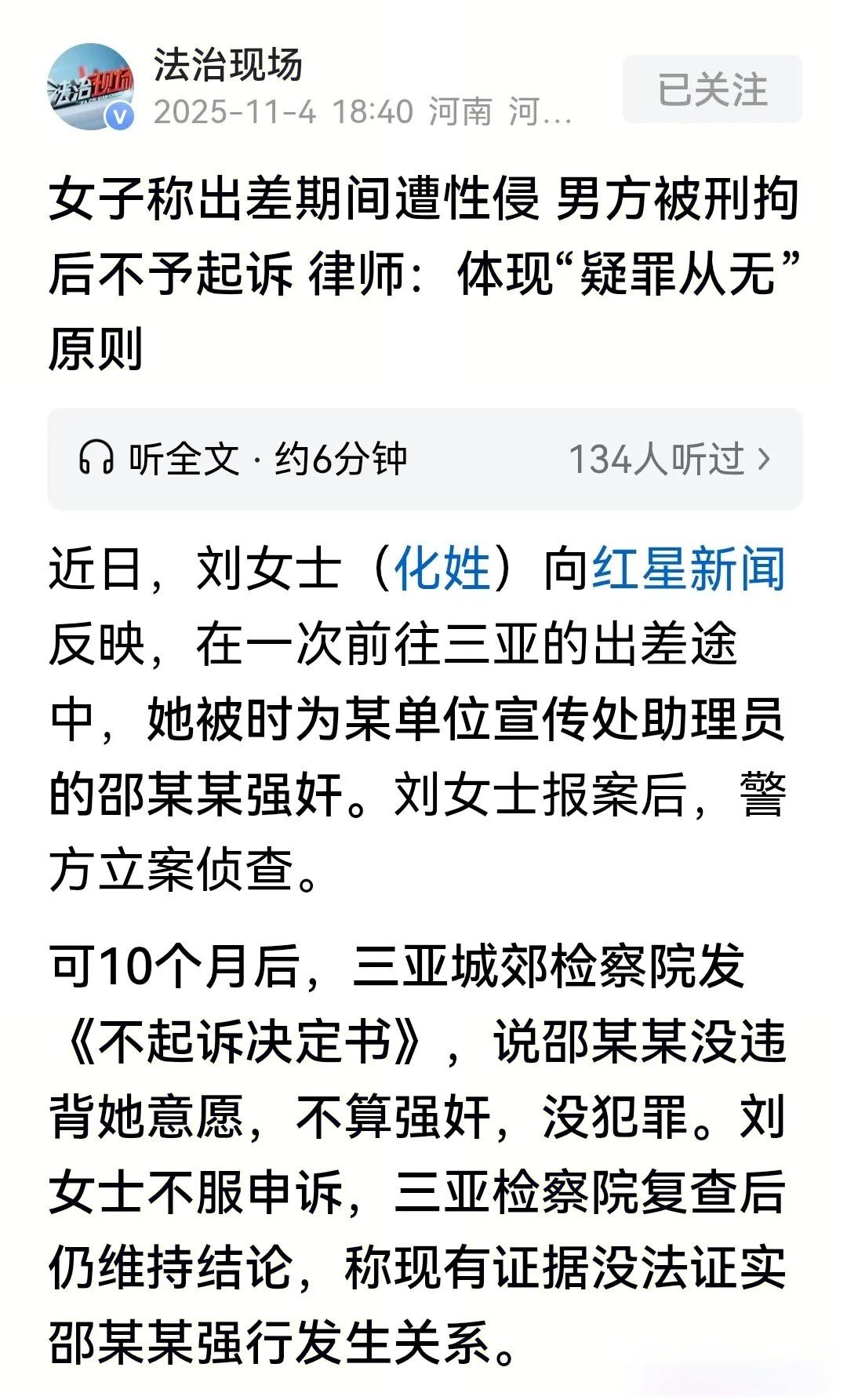 三亚一公司项目经理刘女士,出差时被合作单位男助理邵某借醉酒搭讪,后遭对方强行发生关系。刘女士报警后邵某被刑拘,可最终检方以“证据不足”作出不起诉决定,刘女士还被公司辞退。本文拆解案件关键细节,用通俗语言解读“疑罪从无”法律原则,梳理网友正反观点,聊聊职场女性如何保护自己,以及刑事案件中“证据”有多重要。 一、饭局变噩梦:好心送醉汉,竟成“引狼入室” 刘女士是某公司项目经理,2023年11月跟着公司去三亚参加项目颁奖活动,这也是她第一次和合作单位的助理邵某线下见面。 12月9号晚上,邵某组织夜宵饭局,饭桌上就刘女士和另一个叫韦某的女性,其余都是男士。刘女士滴酒没沾,可邵某说自己喝多了,不想去下一场活动,让刘女士顺路送他回同一家酒店,刘女士想着都是工作伙伴,就答应了。 到了邵某房间,刘女士特意敞开房门,刚想转身走,邵某突然上手搂抱,还亲她、摸她隐私部位!刘女士吓得大喊“想想你老婆孩子,我要报警了”,奋力反抗,邵某这才停手道歉。正好韦某不停打电话过来,邵某说要下楼处理,刘女士赶紧逃回自己房间,情绪直接崩溃。 本以为这事就这么过去了,没想到凌晨邵某又来敲门,说要当面解释道歉。刘女士犹豫了一下还是开了门,结果邵某直接翻脸,强行和她发生了两次关系!刘女士拼命反抗,指甲都撕裂了,右乳腺还被咬伤,医生后来都建议打狂犬疫苗,睡裤也被扯坏了。 事后邵某还在平台下单了避孕药,看着刘女士吃下去才走。刘女士没乱了分寸,赶紧下单新内裤,把沾有邵某体液的旧内裤妥善保存,这后来成了关键物证。第二天她强撑着参加颁奖典礼,还按工作要求和邵某互相拍照,可转过天凌晨,她就下定决心报了警。 警方很快立案,邵某被刑拘,2024年2月案件移交检察院,邵某改成取保候审。本以为正义会到来,可10月检方的“不起诉决定书”让刘女士彻底懵了——检方说邵某没违背她意愿,不构成强奸罪!刘女士不服申诉,结果被维持原判,更让她崩溃的是,公司还把她辞退了。 二、法律拆解:为啥刑拘了还能“无罪”?“疑罪从无”不是放纵 很多人看完都炸了:都有咬伤、撕裂伤,还有体液证据,为啥不追责?这就得说说刑事案件里的核心原则——“疑罪从无”,不是警方和检方不作为,而是法律对“定罪”的要求极高。 1. 强奸罪的认定:光有“发生关系”不够,关键看“是否自愿” 《刑法》第236条明确规定,强奸罪是“以暴力、胁迫或者其他手段强奸妇女”,核心是两个关键点:一是违背妇女意愿,二是有强制手段(比如打骂、威胁,或者趁人无力反抗等)。 刘女士有指甲撕裂、乳腺咬伤的伤情,还有保存的内裤物证,这些能证明两人发生了关系,也能说明有肢体冲突,但检方要认定“强奸”,还得证明“冲突是因为邵某强制,而非自愿发生关系中的拉扯”。 2. 检方“不起诉”的核心:证据没形成“完整链条” 邵某拍了当时的视频,检方看了之后认为,视频里刘女士没有“明显拒绝或反抗”;再加上第二天刘女士还能和邵某正常拍照,检方觉得这说明她“情绪稳定”,没法确凿证明“违背意愿”。 这里就用到了《刑事诉讼法》的“疑罪从无”原则——简单说,刑事案件要定罪,必须达到“证据确实、充分,排除所有其他可能性”的标准。如果现有证据既不能100%证明邵某有罪,也不能100%证明他无罪,那法律就会倾向于“无罪”,不能让任何人因为“可能有罪”就被判刑。 刘女士说自己当时崩溃又疲惫,无力反抗,但“无力反抗”也需要证据支撑(比如是否被捆绑、是否处于意识不清状态),而现有证据不足以让检方形成“邵某强制”的定论,所以只能作出不起诉决定。这不是说刘女士在撒谎,而是法律对“定罪”的要求就是这么严格,避免冤假错案。 3. 刘女士被辞退:公司做法合法吗? 从法律上讲,刘女士是案件受害者,没有任何过错,公司仅仅因为她遭遇性侵就辞退她,属于违法解除劳动合同。刘女士完全可以申请劳动仲裁,要求公司支付赔偿金,这是她明确的合法权利,不能吃这个哑巴亏。 三、网友吵翻:是“法律严谨”还是“受害者太难”? 事件曝光后,网友的观点直接分成两派,吵得不可开交: 心疼受害者派:“太窒息了!受害者要保留证据、要反抗,还要面对‘没明显拒绝’的质疑,太难了!被咬伤、指甲撕裂还不够证明强制吗?第二天正常工作是职业素养,怎么就成了‘自愿’的证据?” 理解法律派:“疑罪从无是保护所有人的,今天为了‘解气’突破证据标准,明天可能就有人被冤枉。检方不是不站受害者,而是没足够证据定罪。” 吐槽职场派:“公司太恶心了!受害者反而被辞退,这是在纵容施暴者吗?以后谁还敢在职场里维护自己的权益?” 法律是底线,但底线之上,更该有人情味。你觉得检方的决定合理吗?职场中遇到类似的“暧昧试探”,该怎么保护自己?欢迎在评论区说说你的看法。