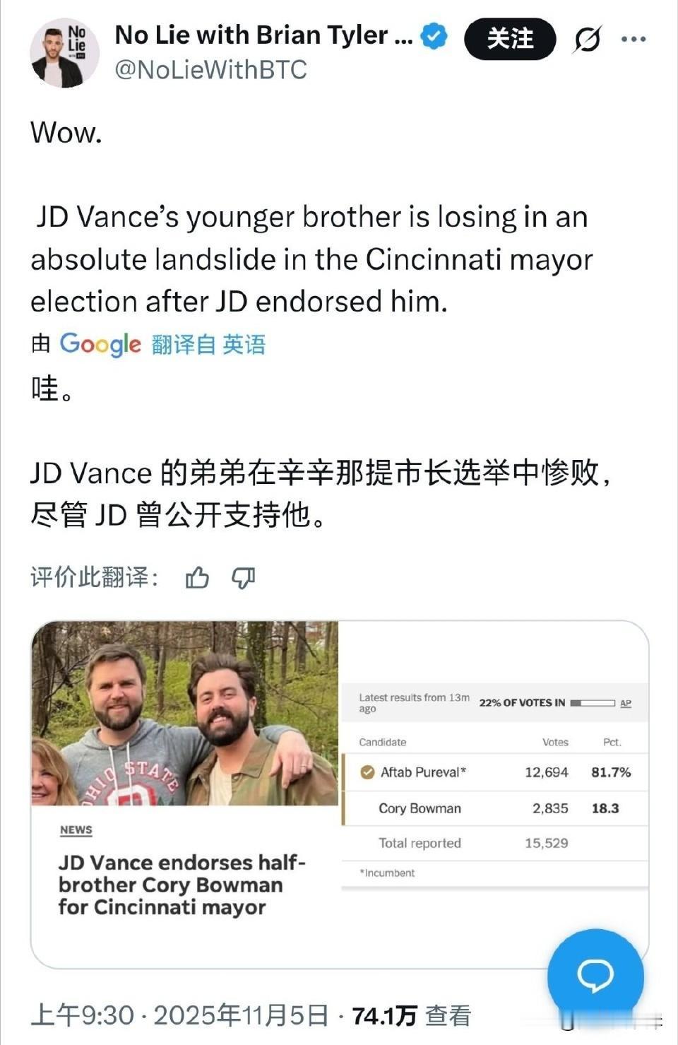 副总统JDVance的弟弟在辛辛那提市的市长选举中惨败,仅获得18%的支持率。