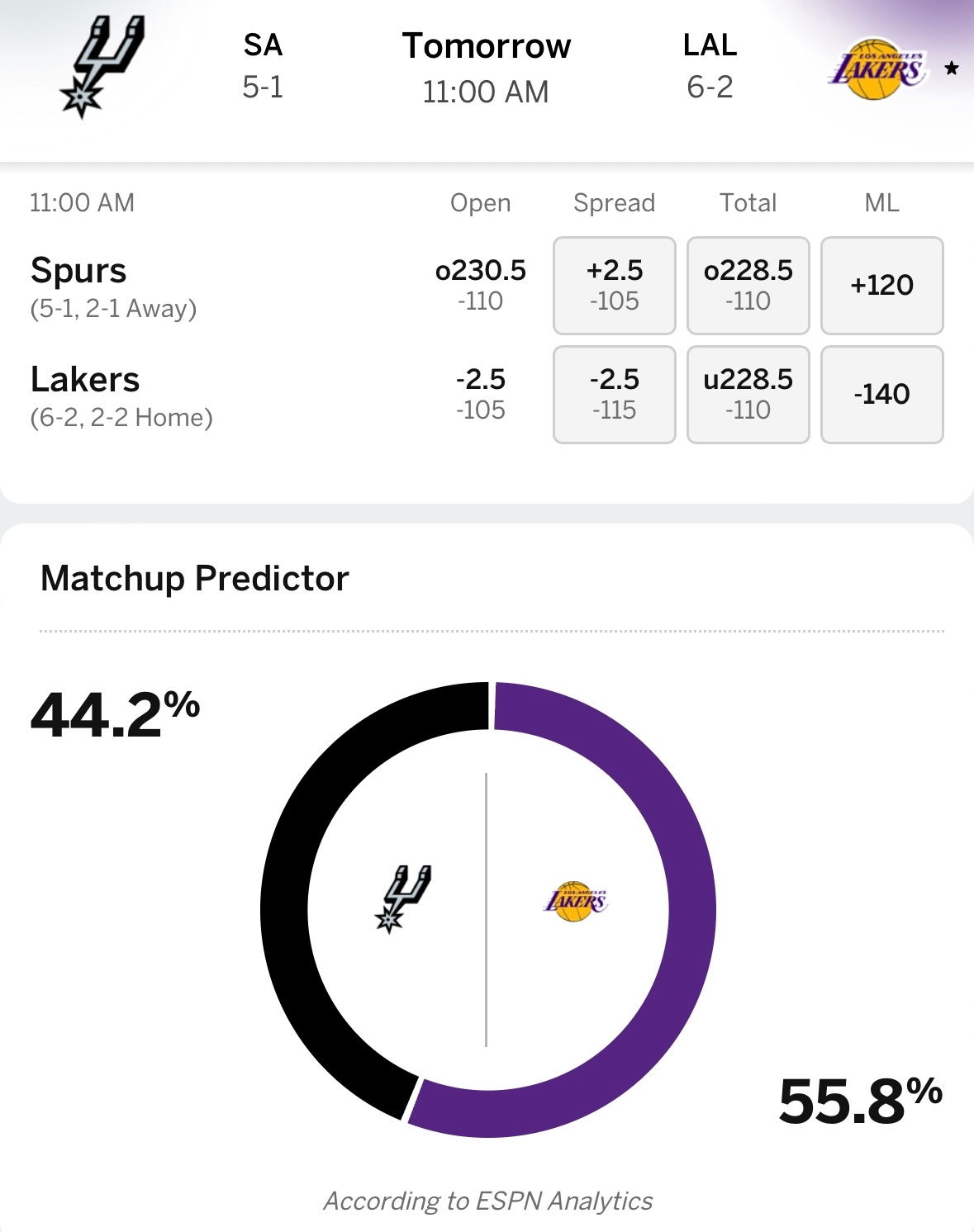 湖人明日11点对阵马刺,ESPN给出获胜概率:马刺44.2%,湖人55.8%。