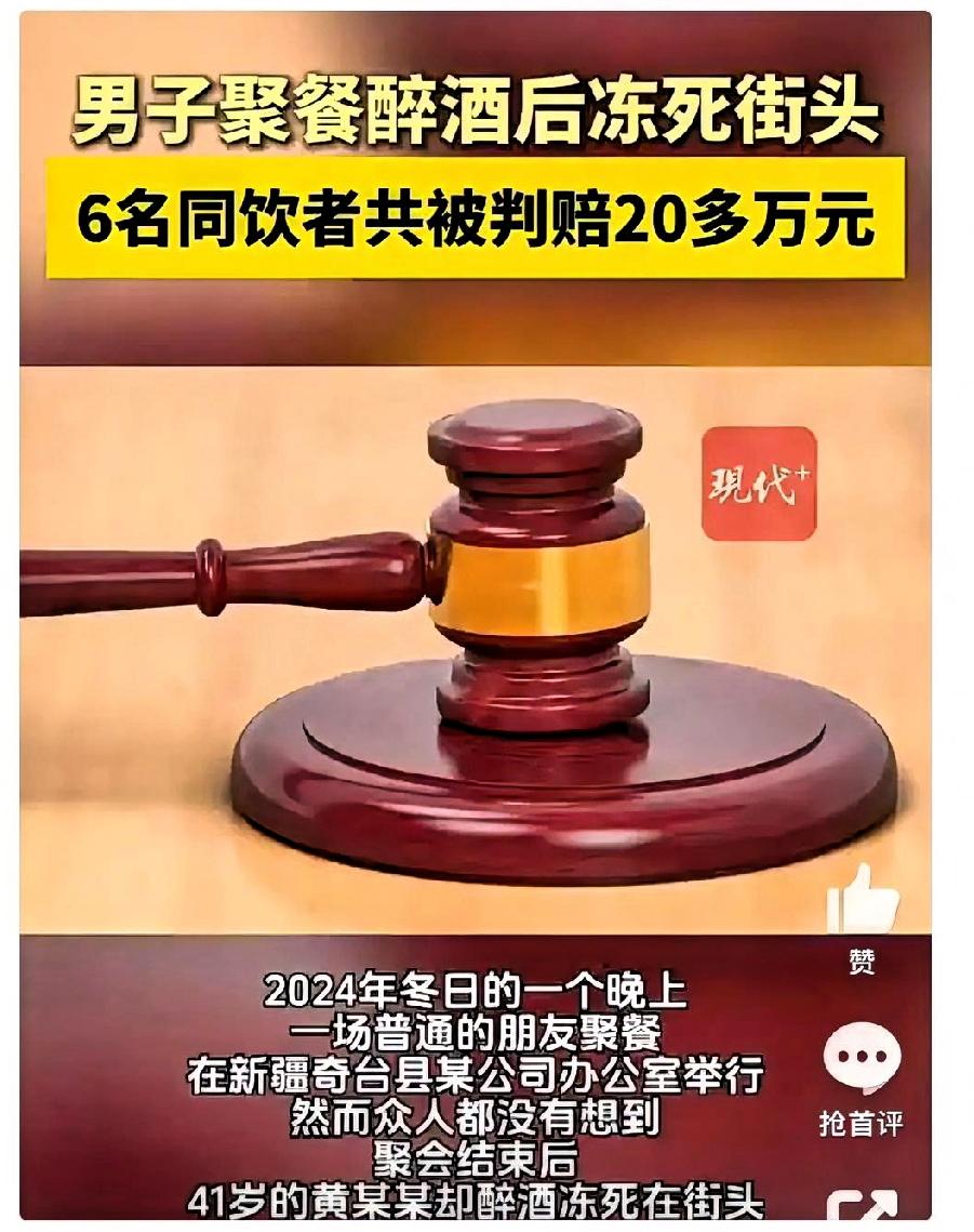 先说新疆奇台县这起“酒局悲剧”:41岁的黄某某跟6个朋友聚餐,白酒加啤酒混着喝,散场后独自打车回小区。可第二天清晨,他被发现冻死在自家楼旁的空地,监控显示他下车时走路直打晃,夜里零下二十多度,没人扶一把,最终活活冻坏。 警方认定黄某某为“非正常死亡”,其父母将同饮者告上法庭索赔37万。 经法院审理认为,黄某某的死亡系非正常死亡,但同饮者并没有主观故意伤害黄某某的行为,对其死亡的发生也不具有直接的因果关系,对黄某某死亡的发生只能说是疏忽的结果,属于间接原因。 根据《民法典》规定的过错责任原则,黄某某的父母将同饮者作为共同被告要求赔偿的诉讼请求不应全部支持。 最终法院判决黄某某自负主要责任,同饮者张某某等人共同承担赔偿责任,具体赔偿如下:1.医疗费、护理费、丧葬费等各项费用合计1134176.88元,黄某某父母已支付部分为37829.50元,现需继续支付75447.38元。 黄某某自负主要责任(50%),赔偿款由张某某等人承担。 张某某赔偿6%,姚某赔4%,柳某赔4%,其他3人各赔2%,接送的尹某无责。2.精神抚慰金未判给。 法官认为同饮者只存在疏忽行为,没有对黄某某醉酒后发生的严重后果有直接的致害行为,出租车司机不应承担赔偿责任。 由此可见,喝酒时不忽视安全问题很重要,一旦发生事故,躲不过的责任照样得承担。 麻烦看官老爷们右上角点击一下“关注”,既方便您进行讨论和分享,又能给您带来不一样的参与感,感谢您的支持!