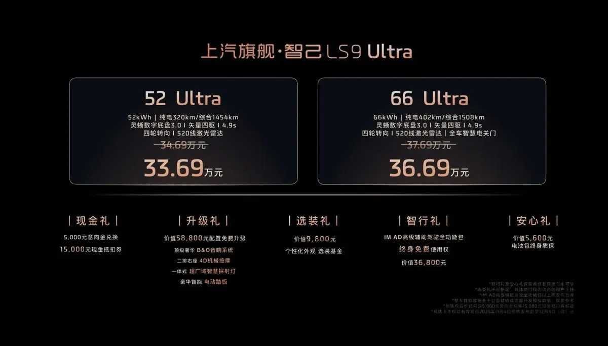 在智能与豪华层面,LS9同样毫不妥协,搭载行业首创的ERNC 2.0主动降噪技术,真正做到了增程器介入时的绝对无感,全程享受图书馆级的极致静谧。另外还全系标配520线超视域激光雷达和英伟达Thor芯片,并首发搭载B&O音响与4D机械按摩座椅,打造出超豪华、超舒适的移动奢享空间。智己LS9不仅有着颠覆性的技术而且还有极具诚意的价格,可以说是重新定义30万级大六座SUV的市场了。