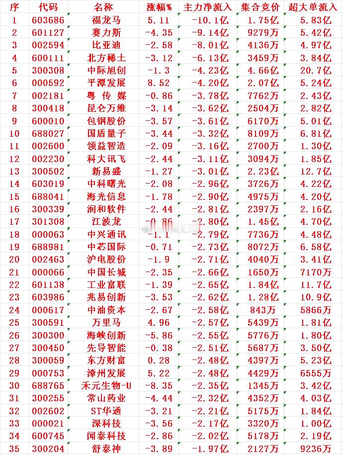 11月5日中午收盘,主力资金“大幅卖出”的35名单: