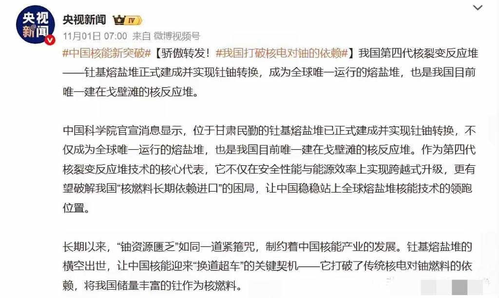 既然央视新闻都播报了,那么很可能传闻就是真的。钍基熔盐核反应堆,这次是真的实现重大突破了。 消息来得很明确。11月1日,央视新闻正式播报,甘肃武威的钍基熔盐实验堆建成,还首次实现了钍-铀转化。 这可不是小进展,这是全球唯一能稳定运行并实现钍燃料入堆的反应堆,属于第四代核能技术。 能做到这一步,首先得感谢咱们的资源家底。中国钍储量超140万吨,占了全球四分之三还多。 更方便的是,钍是稀土的伴生矿。内蒙古包头白云鄂博的尾矿坝里,就堆着7万吨钍。 原包头稀土研究院院长算过,光这一处的钍,就够中国用5000年。这是西方根本比不了的优势。 光有资源不够,技术才是关键。以前最大的难题是材料,熔盐腐蚀性极强,普通金属根本扛不住。 科研团队联手攻关,硬是搞出了GH3535高温合金和专用核石墨,现在反应堆国产化率超90%。 为了确保材料靠谱,一项蠕变性能测试连续跑了56000小时,相当于整整6年没停过。 过程里还出过险情,调试时熔盐管道突然冻堵,燃料根本送不进去。 上海应物所的科研人员顶着45℃高温,在通风差的现场排查,汗流浃背地解决了问题。 这技术的能量密度更是惊人,1吨钍的能量相当于350万吨煤,全国储量能撑近2万年。 网友看完都沸腾了,有人说这是中国的下一张稀土级王牌,也有人称它是沙漠里的未来电站。 在我看来,这不仅解决了能源安全问题,更在新能源领域掌握了话语权。 未来这项技术大概率会先用于大型电站,再逐步小型化,或许真能用到月球基地。 文章描述过程、图片都来源于网络,涉及版权或者人物侵权问题,或有事件存疑部分,联系后即刻删除或作出更改