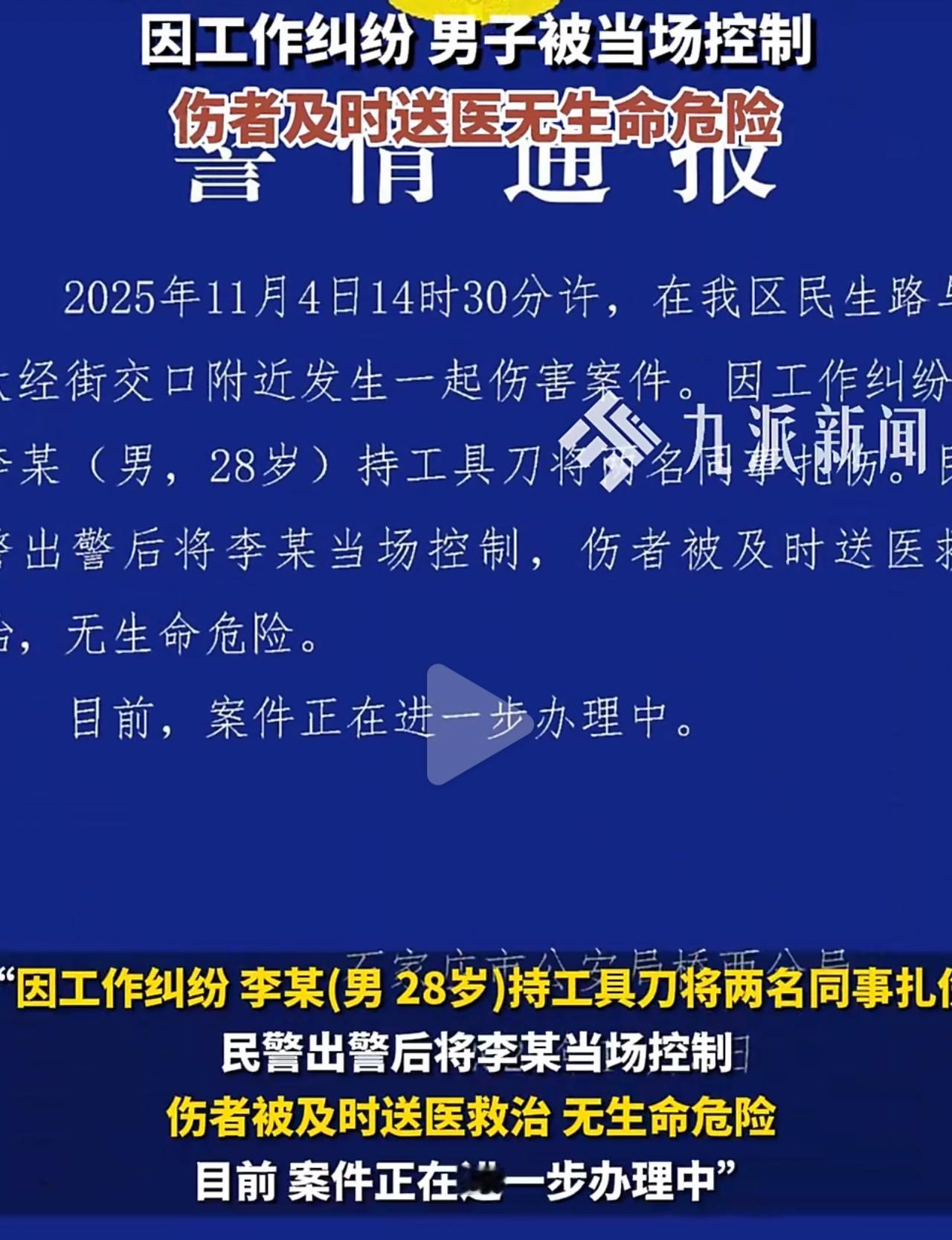 28岁外卖员持刀扎伤俩同事!到底受了多大委屈,能让一个老实打工人豁出去走这步? 2025年11月4日下午两点半,石家庄桥西区街头突然闹出事端!外卖员李某手里攥着把工具刀,直接把站长和副站长都扎伤了,民警火速赶到当场就把他控制住,万幸俩伤者送医后没大碍~ 网传的那些细节,看着真让人心里堵得慌。李某要离职,结果80%的工资被克扣,据说每单提成最后就剩1块钱,他找了好几次要工资,都没个结果。更让人难受的是,他平时就老被这俩站长辱骂推搡,案发前还被人掐着脖子挑衅,网上有视频说,是站长先动的手,李某这才彻底情绪崩溃,抄起刀反抗的。 这事一曝光,网友直接吵翻了。有人心疼李某,说这就是底层劳动者被逼到绝路的无奈反抗;也有人说再委屈也不能用暴力,动手伤人就得负法律责任。 其实不管网传的细节是真是假,这起悲剧都戳中了要害。平台管得死严,工资说扣就扣,职场里还搞霸凌那一套!劳动者有苦没处诉,有诉求没人搭理,这不就是把人往绝路上逼嘛!李某这事儿涉嫌故意伤害罪,十有八九得负刑责,但企业的管理漏洞明摆着,难道就不用好好反省反省? 职场矛盾哪能靠暴力解决啊!可要是公平说话的渠道、合理维权的路子都通畅,谁愿意用毁了自己的方式讨说法?真心希望这事能逼着企业好好完善制度,也盼着劳动保障能真正落到实处,别再让“有苦没处诉”酿成更多悲剧了!持刀事件 刺伤致死 外卖员冲突