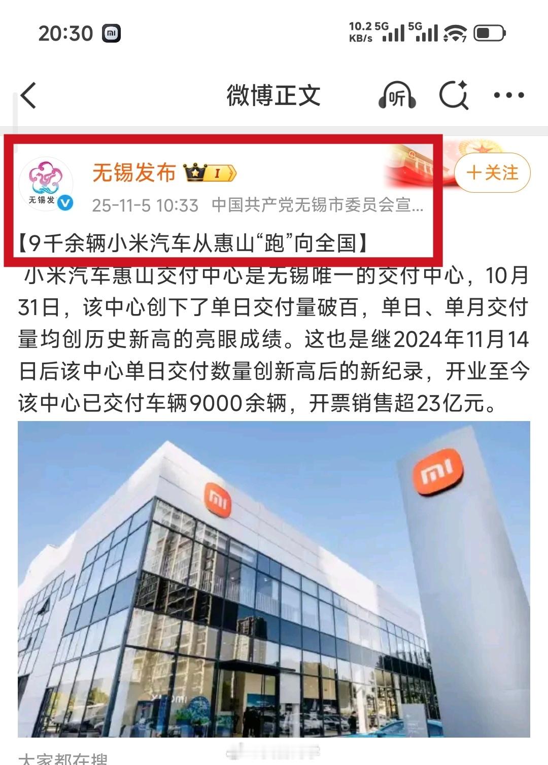 无锡发布:【9千余辆小米汽车从惠山“跑”向全国】