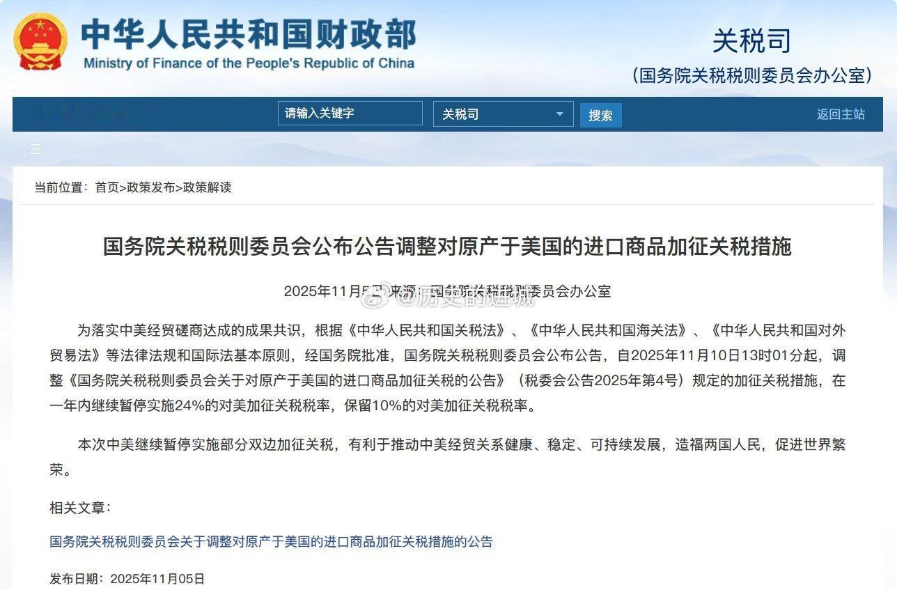 中美11月10日将互降关税国务院关税税则委员会公告:自2025年11月10日13时01分起,调整《国务院关税税则委员会关于对原产于美国的进口商品加征关税的公告》(税委会公告2025年第4号)规定的加征关税措施,在一年内继续暂停实施24%的对美加征关税税率,保留10%的对美加征关税税率。自2025年11月10日13时01分起,停止实施《国务院关税税则委员会关于对原产于美国的部分进口商品加征关税的公告》(税委会公告2025年第2号)规定的加征关税措施。