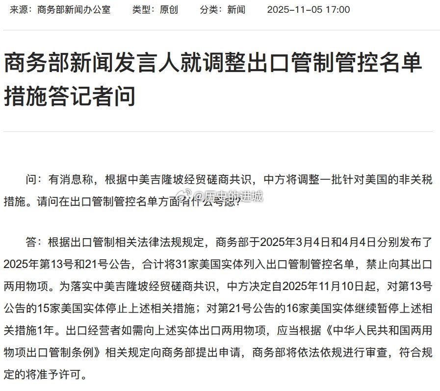 商务部同日宣布:中方决定自2025年11月10日起,对第13号公告的15家美国实体停止两用物项出口管制管控,对第21号公告的16家美国实体继续暂停上述相关措施1年。