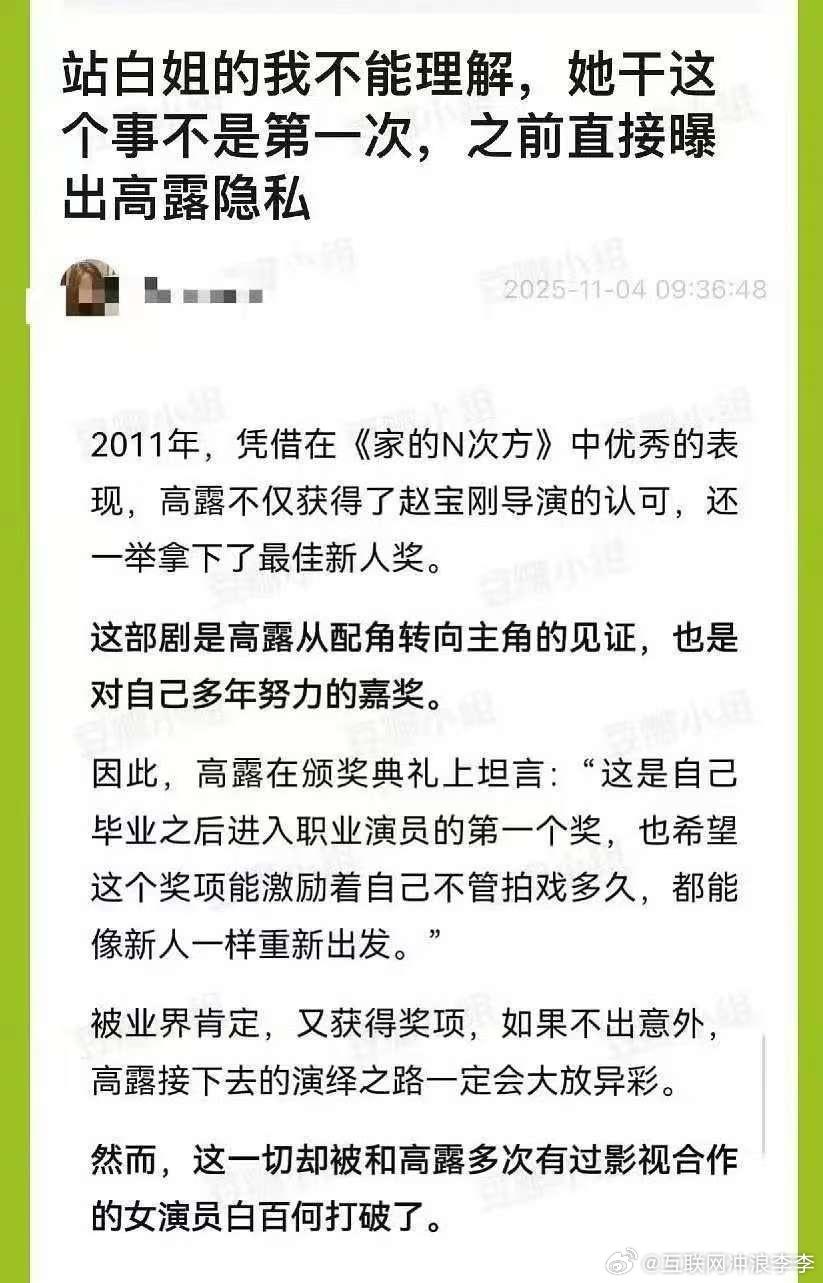 内娱活人白百何:报瓜从无失手,内涵全是预言! 谁懂啊!内娱嘴替白百何又双叒叕封神了!昨天刚暗戳戳内涵王传君,今天就被东京电影节实锤——王传君拿影帝,获奖感言直接点名感谢她!这波“预言家”操作绝了! 要知道姐可是内娱“瓜圈纪检委”,当年《家的n次方》高露拿奖,她直接发文爆对方隐婚生子,字字精准;和某ld更是互撕多年,17年她遇负面,对方朋友圈暗讽“春天来了”,姐也没惯着,内涵反击从不手软。老一辈明星的拉扯战,比电视剧还抓马,白百何这“报瓜必中”体质,建议直接开班授课!