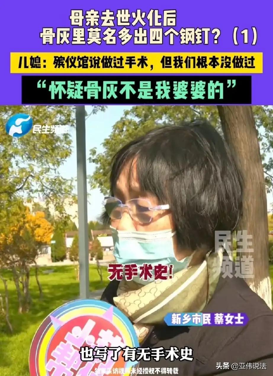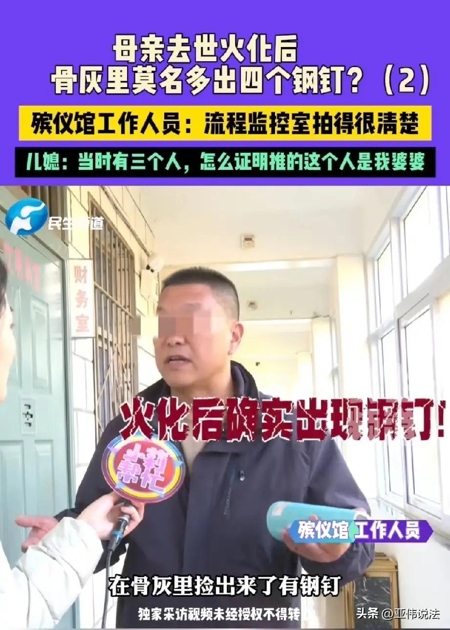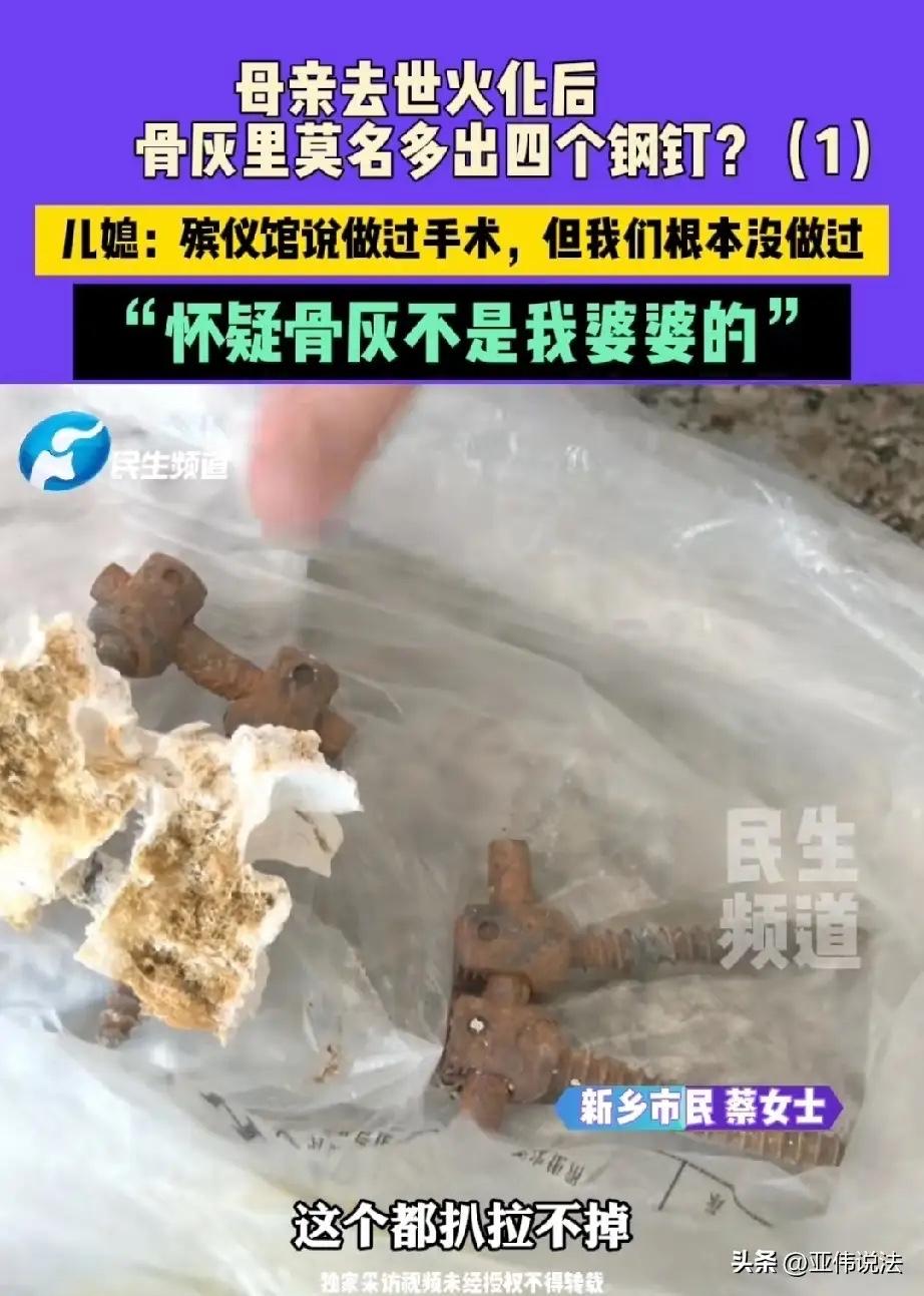 河南新乡,婆婆去世火化后,女子和丈夫去捡骨灰时,发现骨灰里莫名其妙多出四个大钢钉。女子纳闷了,婆婆生前从没做过手术,做核磁也没发现体内有金属,她严重怀疑这骨灰不是她婆婆的,无法给老人下葬。殡仪馆工作人员一口咬定,从遗体到骨灰,他们有完整的闭环,这个肯定是女子婆婆的骨灰。双方查看火化场的监控,结果刚好缺少了最关键的一段视频,殡仪馆的解释更是让女子难以接受。 女子越想越气,拉着丈夫就去找殡仪馆理论。到了地方,工作人员还是那套说辞,说流程没问题,让他们别瞎猜。女子急得眼泪都快出来了,拍着桌子说:“我婆婆好端端一个人,身上咋会有钢钉?你们监控又缺了一段,不是有鬼是啥?” 旁边有个老员工看不下去,悄悄把女子拉到一边,低声说:“妹子,不是我多嘴,前几天有个出车祸的,身上带着钢钉火化的,说不定……”女子一听,脑子“嗡”的一下,赶紧追问。老员工却摆摆手,不敢再多说了。 丈夫也觉得这事蹊跷,跑去问负责火化的师傅。师傅支支吾吾,半天说不出个所以然,最后才含糊道:“那天火化的,好像是有两具遗体,可能……可能弄错了?”这下女子和丈夫更崩溃了,好好的亲人,骨灰都能弄错,这让他们怎么跟家里人交代。