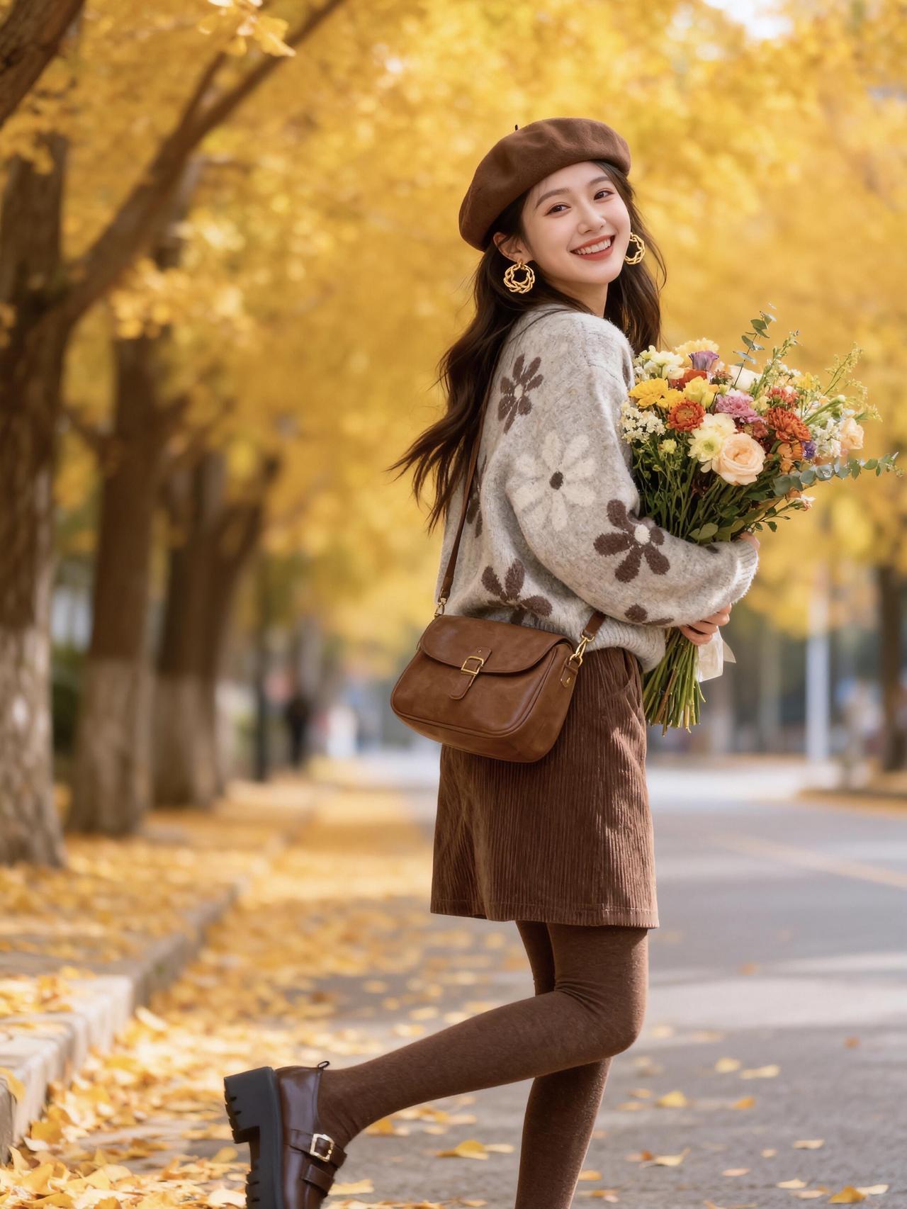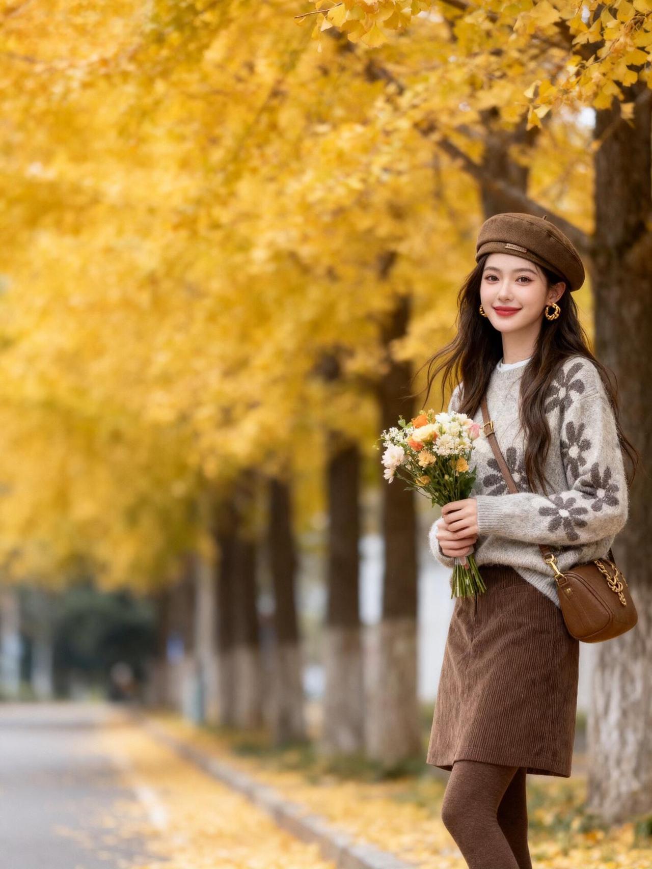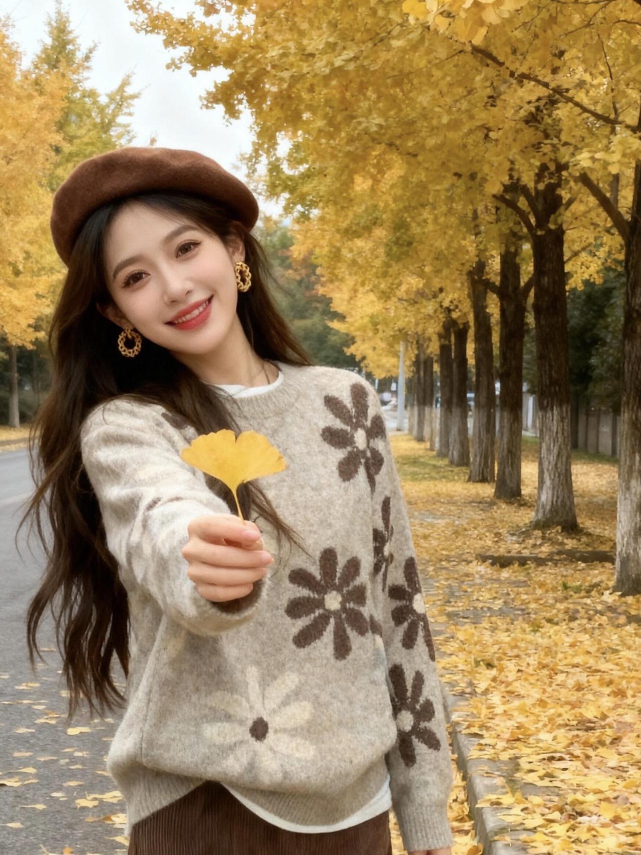 秋日暖阳下少女手捧落叶笑靥如花淡雅秋景自拍 时尚又浪漫穿搭技巧