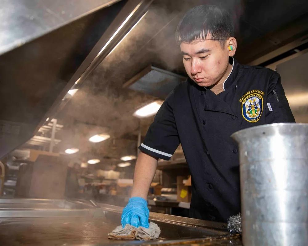 中国人为了能入籍美国,在美国参军的人也不少。 2025年11月3日,分配到黄蜂级两栖攻击舰“基尔萨奇”号(LHD 3)的烹饪专家水手尚鹏飞(Shang Pengfei)在为午餐做准备时清洁烧烤架,“基尔萨奇”号目前停靠在诺福克海军基地的码头旁。