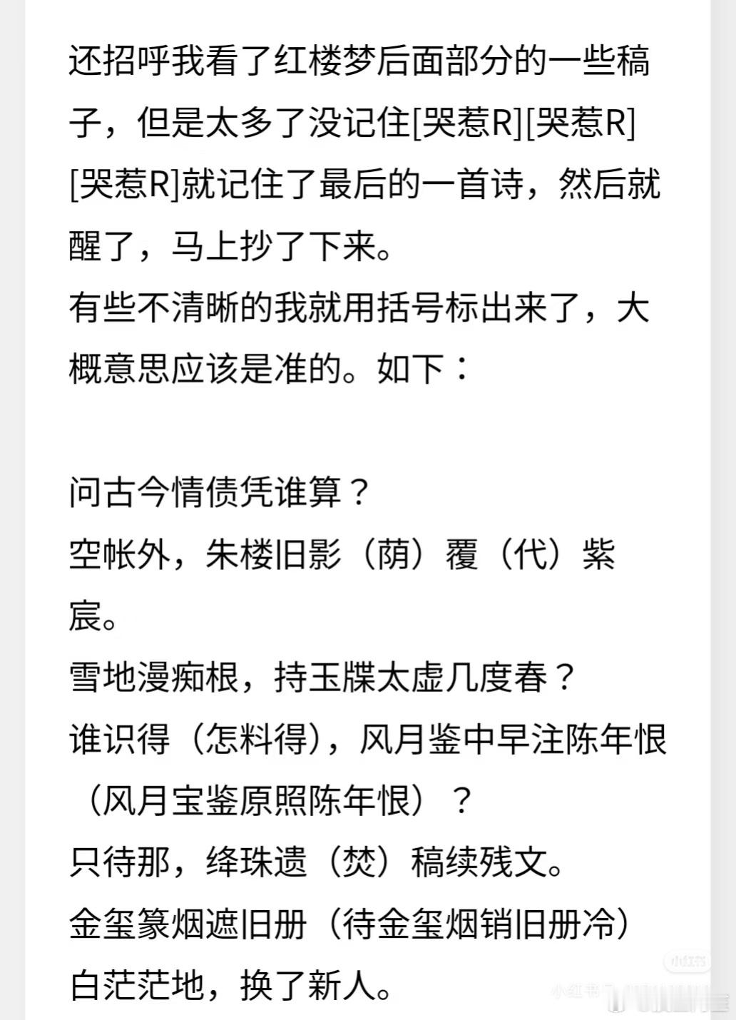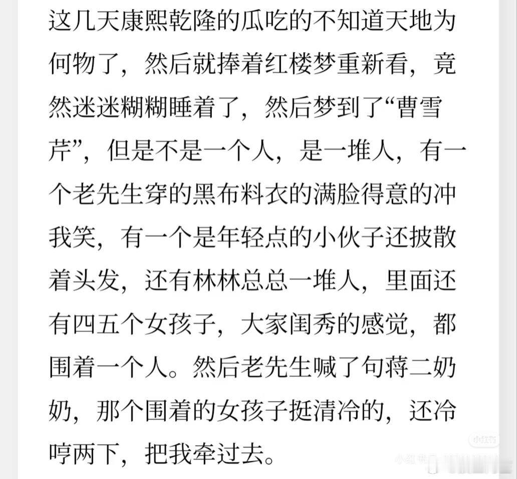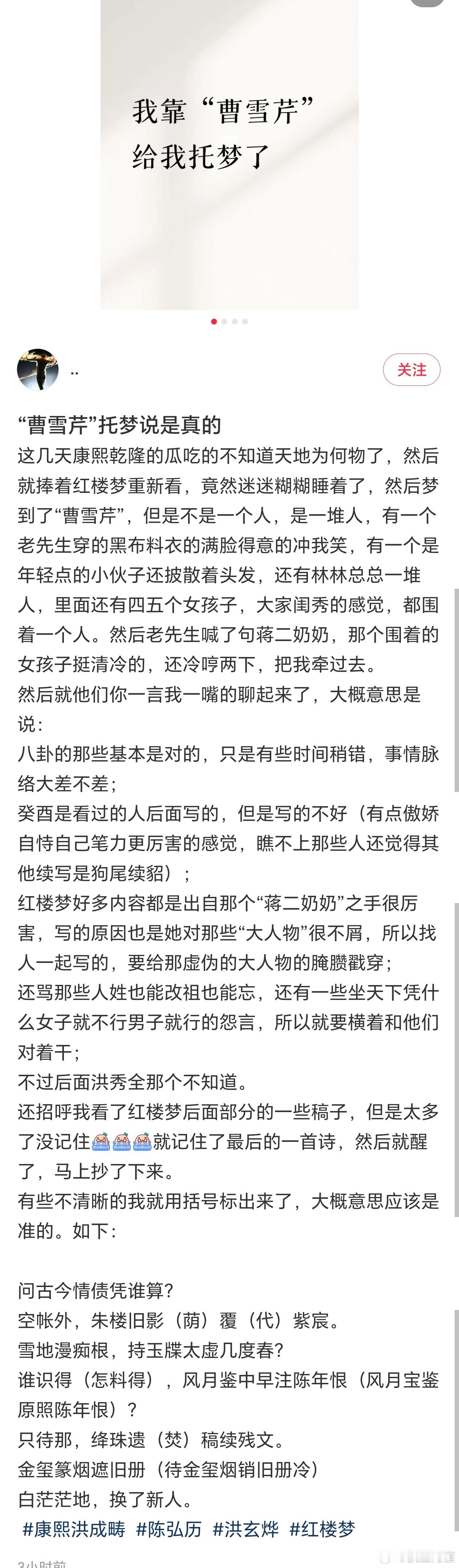 半夜睡不着刷到有人在🍠说曹雪芹给他托梦了,说最近的各种传闻大差不差基本上都是真的,红楼梦很多内容是一个叫蒋二奶奶的人说的,这个人就是跟乾隆换了身份的那个真公主[允悲]关键是博主按照梦抄的诗还真挺有那个意思的