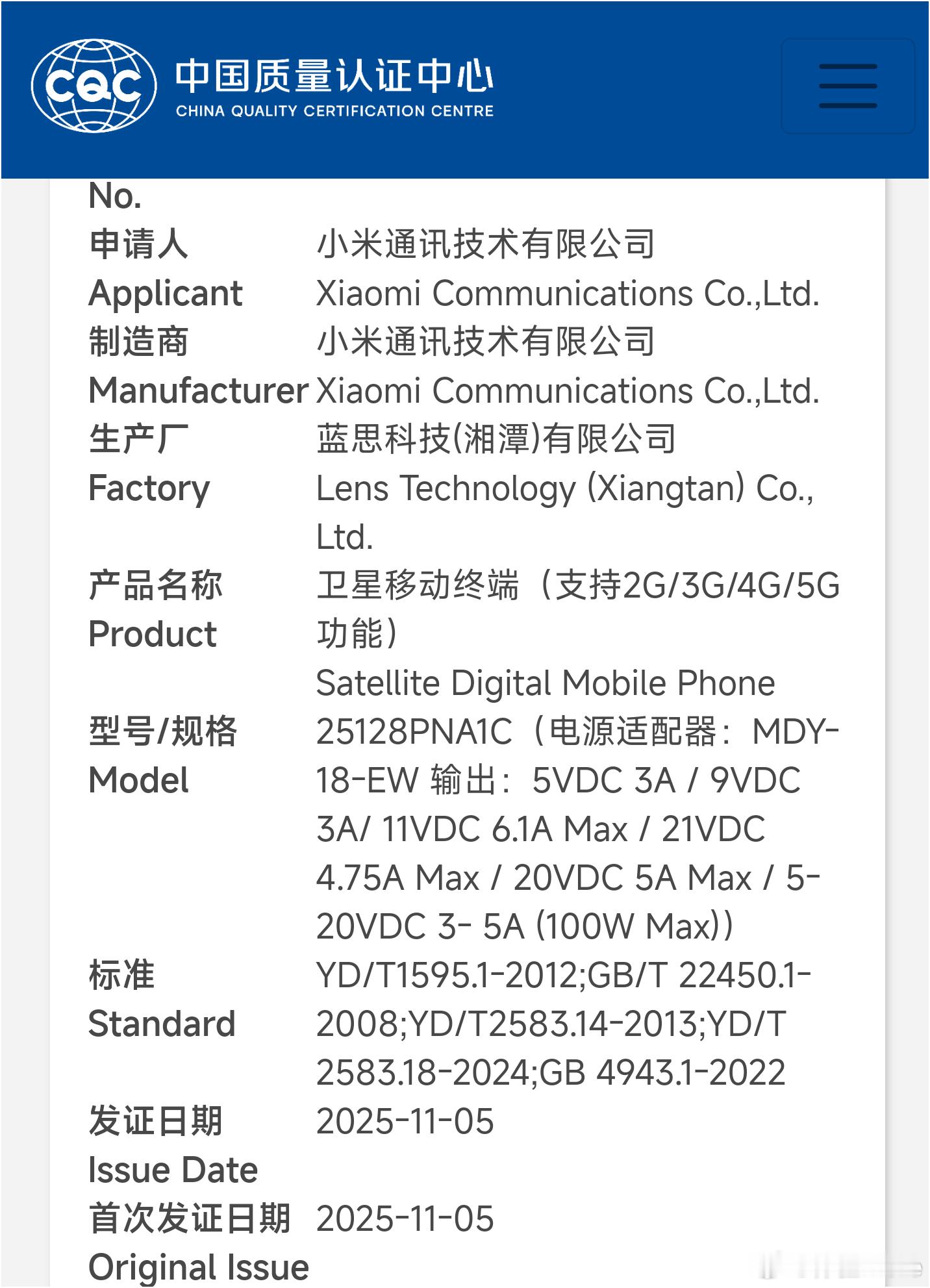 小米17 Ultra和小米17 Ultra双卫星版通过质量认证,100W+6800mAh。