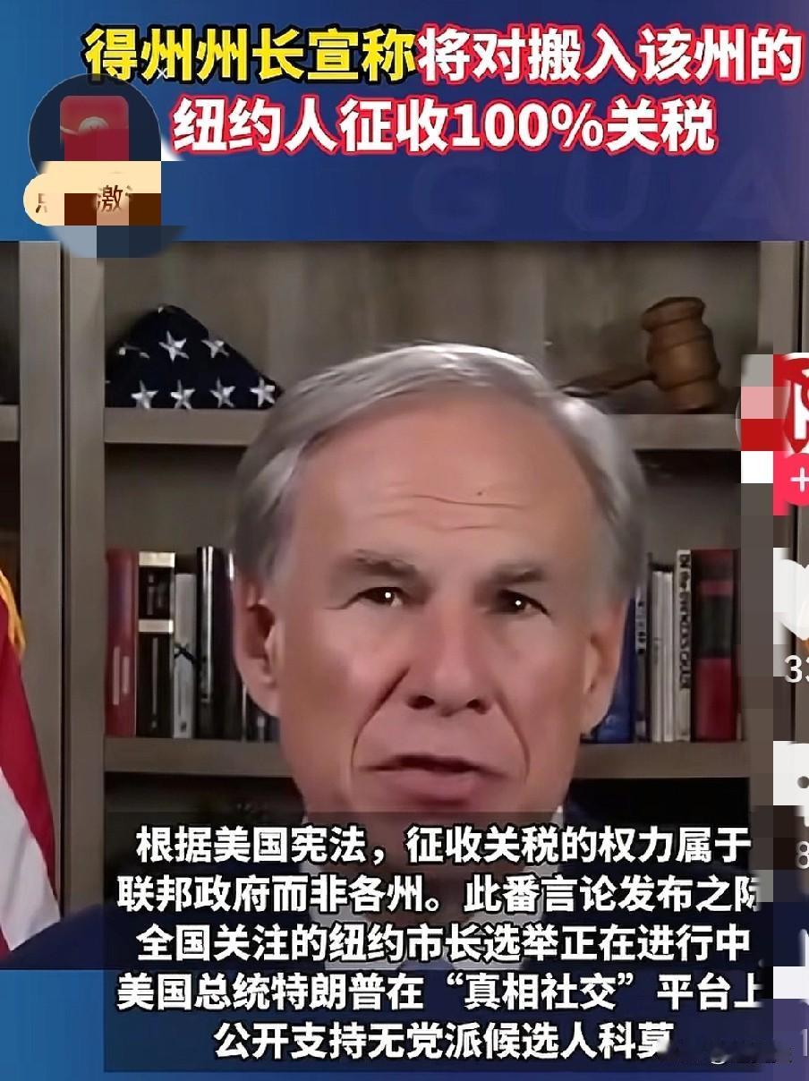 得州州长宣布对搬入该州的纽约人征收100%的关税。能把人笑活了。有样学样,共和党籍的州长看不惯民主党籍的新当选纽约市长,直接征收关税了哈哈哈。真是自由民主国家,谁想干什么就干啥呗。也不怪他们,他们的爷爷们就是这样从欧洲或英格兰等地叛离而来,有反叛基因。以前有南北战争,我觉得还是东西南北战争更好。那样显得更自由。