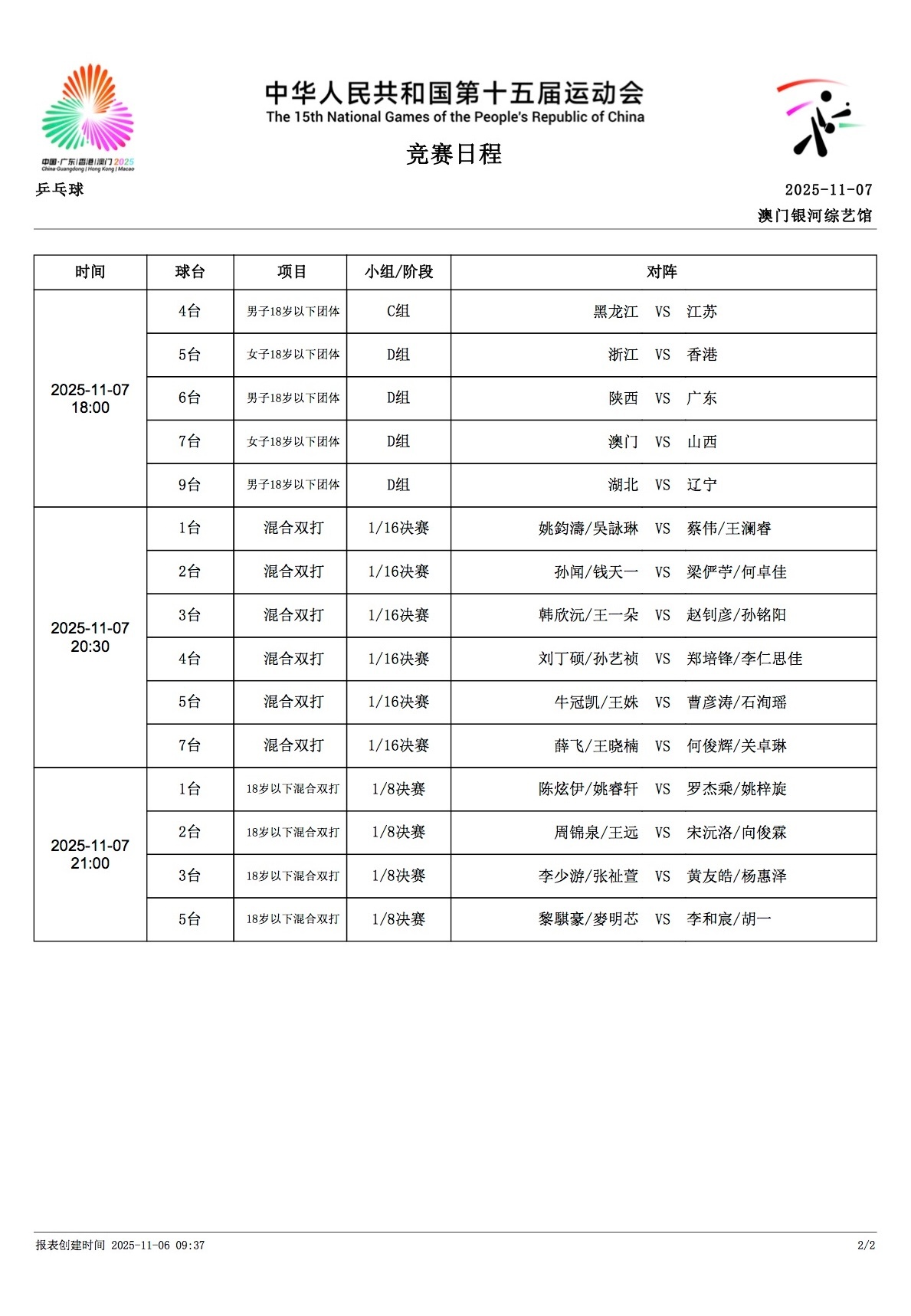 全运会 乒乓球青年组男团小组赛分组A组:上海、河北、澳门、广西B组:河南、山东、