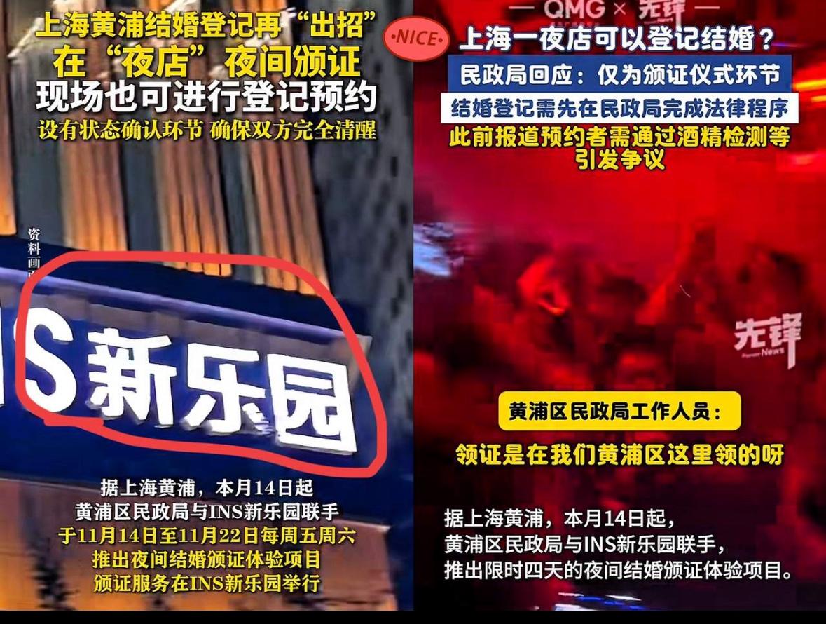 上海,不愧是魔都,连结婚都搞的这么魔幻! 11月4日,上海黄浦区表示,民政局与INS夜店合作,其目的是为了推动情侣结婚,民政局可直接入住夜店给他们提供更快捷的服务,其目的是推动情侣结婚登记。 消息一出,一片哗然!虽然官方一再解释说只是 “颁证仪式体验”,法定登记仍在民政局,但网友的吐槽已经精准地戳穿本质:合着领完证还要去蹦个迪巩固婚姻? INS,位于黄浦区复兴公园内,在上海,那可是潮人的聚集地。集电竞、音乐、演艺于一身的商业综合体,来这里的人,可想而知。民政局入驻夜店,无论是出于哪种目的,都让人觉得是一件很离谱的事。 难难怪网友们吐槽,夜店玩嗨时领个证,第二天还得再领一个证,这不是调侃是事实,来夜店的人还是一夜情比较合适。毕竟民政局小红本和夜店霓虹灯看的就很让人迷惑。 出这主意的是何许人也?怎么能出此下策。民政局的职责是守护婚姻的严肃性,而夜店的使命是提供娱乐体验,两者的调性原本就是南辕北辙,这样的合作还能有好结果? 我们都认为是很离谱的事,而大咖老胡却认为是好事!