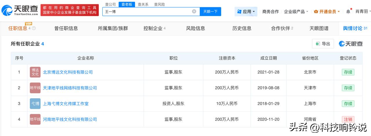 【王一博已注册个人姓名商标 王一博名下关联4家企业】曝王一博不续约乐华 天眼查App显示,王一博名下共关联4家企业,其中3家为存续状态,包括北京博远文化科技有限公司、天津地平线网络科技有限公司、上海弋博文化传媒工作室等,涉及科技、传媒领域,王一博在上述公司担任监事等职务。 值得注意的是,王一博持股70%的天津地平线网络科技有限公司已申请注册多枚“王一博”“耶啵”“WANGYIBO”商标,国际分类涉及运输工具、灯具空调、乐器等,当前部分商标已注册成功。 天眼查信息:-c4288163358