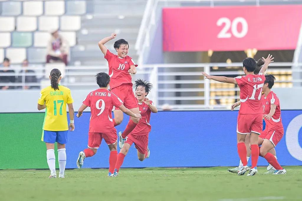“神秘之师”朝鲜女足真的太牛啦!朝鲜U17女足2比0战胜巴西U17女足,巴西女足被淘汰,朝鲜U17女足进决赛,上一届朝鲜U17才是世界杯的冠军,看样子今年又要卫冕冠军了。 上半场双方拼抢激烈,身体对抗比较大,双方都没有什么太好的机会,比赛很焦灼,直到44分钟,巴西女足后卫禁区手球染红,红点套餐,朝鲜获得点球,俞正香点球命中打破僵局,上半场朝鲜1比0巴西,朝鲜多一人应战,朝鲜队开场就猛攻,下半场第7分钟,俞正香抽射破门,完成梅开二度,巴西队无力回天,全场比赛结束:朝鲜U17女足2比淘汰巴西U17女足,朝鲜晋级决赛。 朝鲜U17女足本次世界杯已经6连胜,狂轰22球,实力真的太恐怖了,朝鲜女足再次剑指卫冕冠军,让我们拭目以待吧!