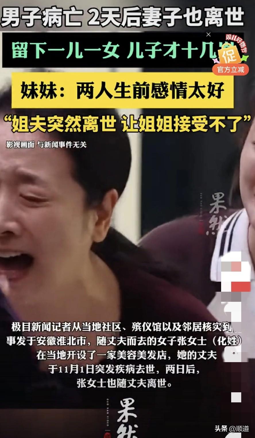 近日,安徽淮北一对夫妻,两人结婚18年,育有一儿一女。 特别就在于两人感情出奇的好,每天还是如胶似漆,形影不离。 然而意外却忽然降临,丈夫突发心脏病意外离世。面对丈夫的突然死亡,妻子悲痛欲绝,嚎啕大哭。 也许是悲伤过度,两天后,妻子也因病去世了。 妻子妹妹唏嘘不已,感叹姐姐姐夫的真挚情感。 表示两个孩子她会照顾好。 女儿已经上了大学,儿子才十几岁。 夫妻一起走了,留下孩子才十几岁就太可怜了。 其实妻子也没想到自己会死吧,假如让她选择,相信她为了孩子也会活下去的。 所以,还是以平常心生活吧,夫妻之间吵吵闹闹,磕磕绊绊才正常,不离不弃就行了。 不用太好,这太好了,一方突然没了,另一方受不了有生命危险,影响下一代呀。