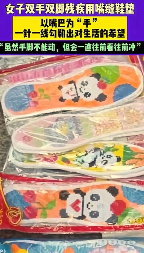 “谁看了不心疼?”重庆,一女子双手双脚残疾,摆摊卖鞋垫谋生,本以为鞋垫是从外面进的货,结果摊位前上演不可思议的一幕:她跪坐在地上,用嘴巴叼着针线为鞋垫绣花,速度娴熟丝毫不比手缝的差。网友泪目:太励志了!她究竟怎么做到的? 11月刚到,重庆的街头已带上几分凉意,在一处人来人往的街角,有个小摊格外引人驻足。 摊主是位来自江津的代姓大姐,今年36岁。 她没法像常人那样站立或端坐经营,只能跪坐在地面,膝盖下垫着轮胎片裹布做成的护具,那是她为减轻跪行疼痛专门弄的。 轮椅的坐垫上,几双绣花鞋垫摆放得整整齐齐,针脚细密不说,上面的花纹也十分精巧。 起初,不少路过的人都觉得这些鞋垫是她批发来的。 毕竟谁也想不到,一个双手畸形无法正常使用、双脚也动不了的人,怎么做出这般精细的手工活。 直到有人停下脚步仔细观察,才发现了那个让人心里一揪的事实,代大姐低着头,用嘴巴衔着一根细细的缝衣针,另一只脚轻轻压住鞋垫,一针一线地绣着图案。 她看准位置扎下针去,再小心地把鞋垫翻个面,用嘴把针拔出来,掉转方向后继续下一针,整套动作熟练得让人心疼。 代大姐的手脚残疾是天生的,别说从事体力活,就连吃饭、洗漱这类日常琐事,都得依靠嘴巴来辅助完成。 一年多以前,为了撑起两个女儿的生活,她开始自己琢磨着绣鞋垫。 刚学的时候,单是用嘴穿针就要花费好长时间,稍微不注意,针尖就会戳破嘴唇,鲜血渗出来,疼得她眼眶发红。 但她从来没打过退堂鼓,练得久了,手法渐渐熟练起来,只是偶尔还是会被针扎到。有人问她这么难为何还要坚持,她只是淡淡一笑,没多做解释。 后来大家才知晓,她离婚后独自抚养两个孩子,摆摊卖鞋垫挣来的钱,就是一家人最主要的生活开销来源。 一双鞋垫,代大姐要绣上好几天甚至十几天,正面的花纹栩栩如生,背面的针脚也整齐得无可挑剔。 一开始,她想着这么费功夫的手工活,标价100元一双应该不算贵,可问的人多,买的人少。 为了能多卖几双,给孩子多挣点生活费,她后来把价格调到了三四十元,有人讲价,她也愿意再便宜点,遇到好心人特意多给钱,她总会记在心里。 11月4日,有网友把代大姐绣鞋垫的样子拍了下来发到网上,没想到一下子就火了。 视频里,她跪坐在地上专注刺绣的身影,打动了无数网友。 大家这才知道,这个连基本行动都困难的大姐,一直靠着自己的力气谋生。 当地政府早就关注到了代大姐的情况,残联也一直有相关的帮扶政策,保障她的基本生活,可她从来没想过要靠着补助过日子,总想着自己多干点,给孩子更好的生活。 视频走红后,全国各地的好心人都想帮她一把。有人找到她的社交账号发红包,有人直接通过支付宝转账,转账留言里满是“加油”“挺住”这样的鼓励。 代大姐是11月4日晚上才发现支付宝里不断有转账提示的,看着那些陌生的名字和暖心的留言,她心里又暖又感动。 还有不少网友说,想买一双她的鞋垫,不是出于同情,是真的佩服她这份靠自己的骨气。 如今,代大姐还是每天按时出摊,跪在那个小小的摊位前,用嘴巴一针一线地绣着鞋垫。 阳光好的时候,光线落在她专注的脸上,也落在那些绣着花纹的鞋垫上,透着一股不一样的劲儿。 她从来没在别人面前抱怨过生活的苦,也没刻意卖过惨,只是安安静静地做着自己的活计,用最实在的方式,为自己和孩子撑起一片天。 生活给了代大姐太多的坎坷,可她没被打垮。 她不用双手也能绣出精美的鞋垫,不用双脚也能“走”出自己的人生路。 这份不依赖别人、靠自己打拼的坚持,正是最动人的生命力量,也难怪会让那么多人为之感动。