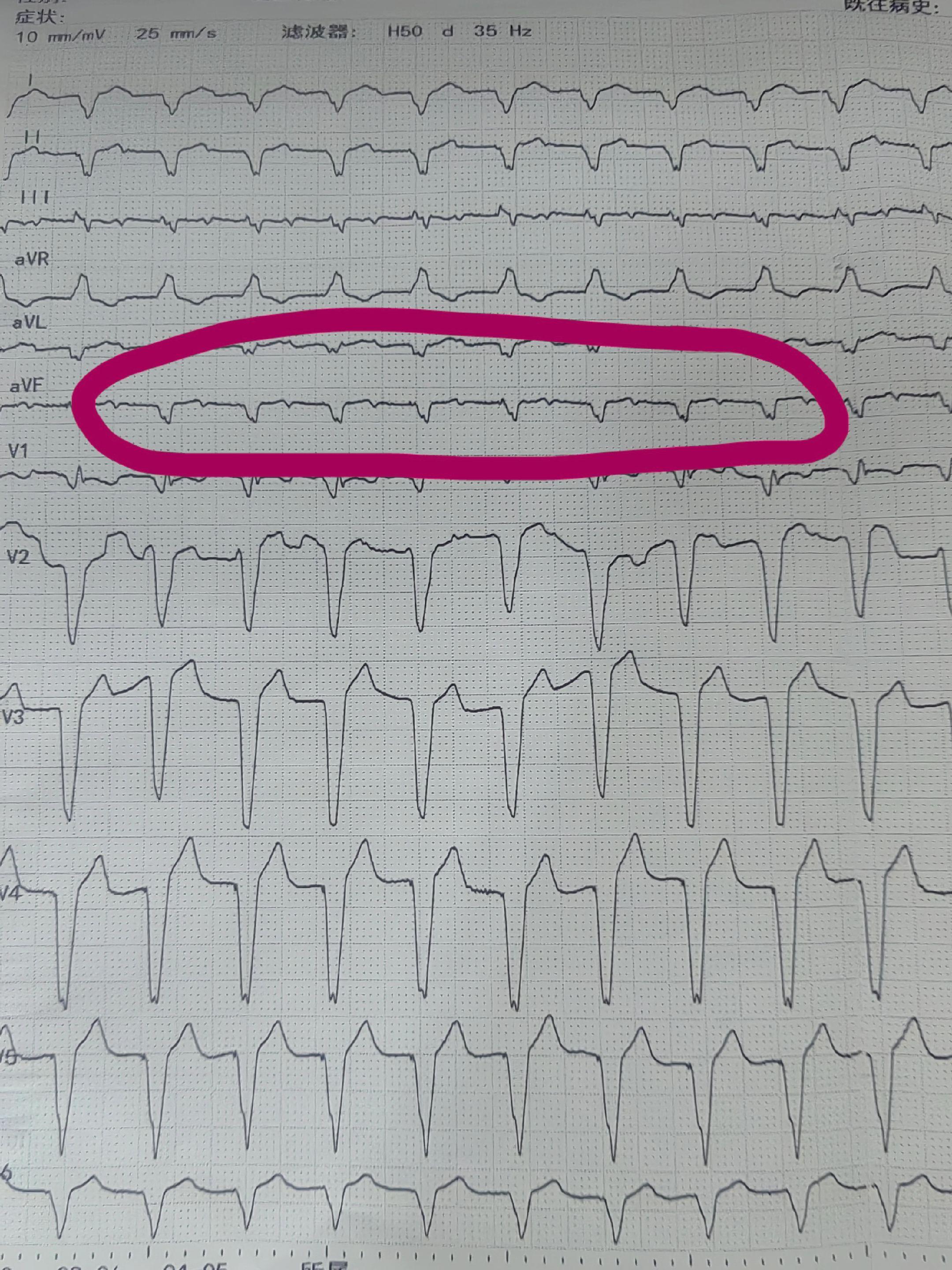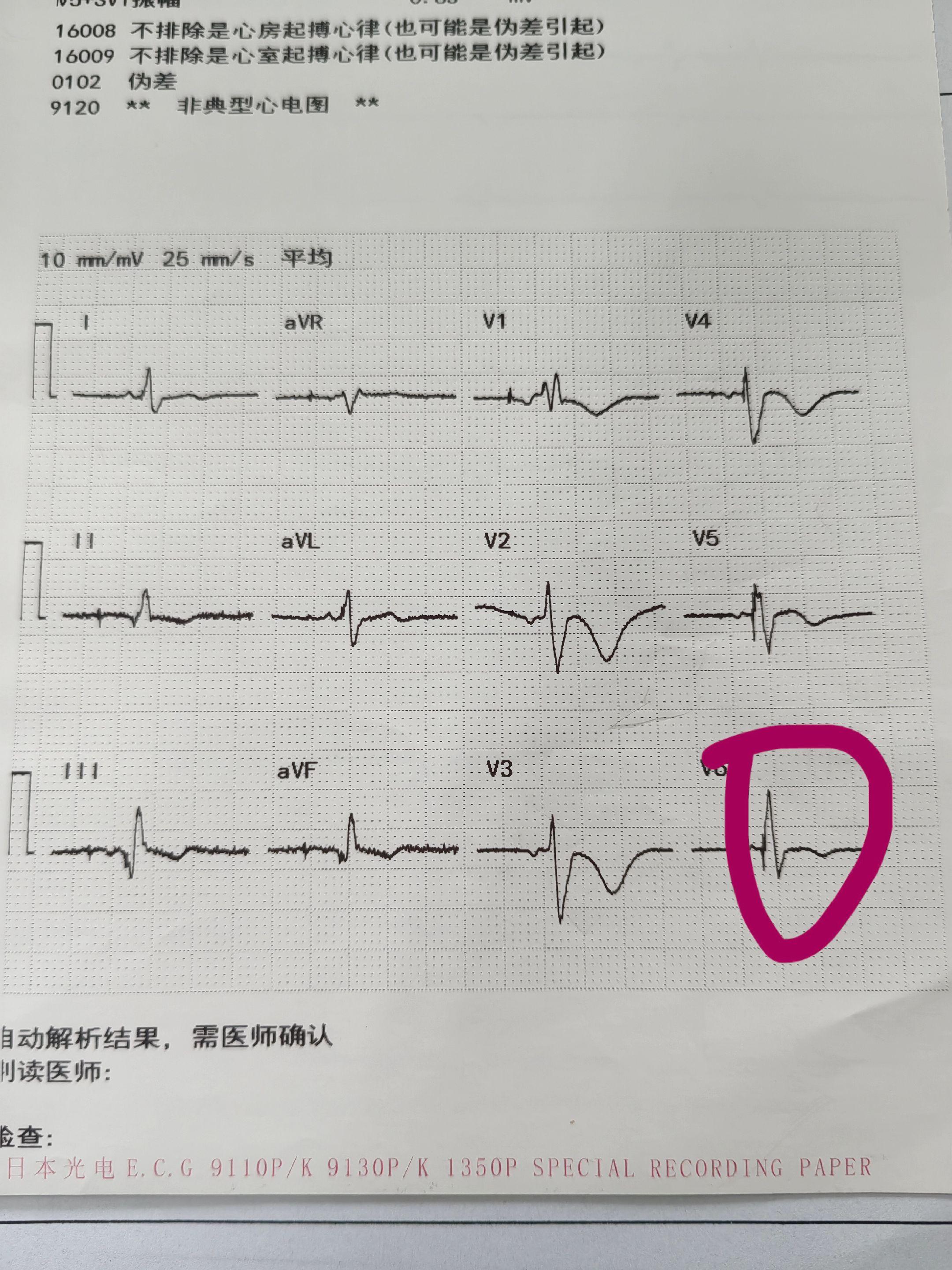 心电图提示下壁导联肺型P波,支持慢性阻塞性肺病,下壁导联、前壁导联T波...