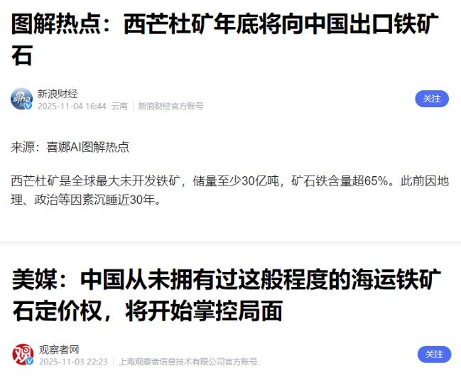国运来了挡都挡不住,30亿吨铁矿重见天日,美国媒体:中国将改写全球铁矿格局!11月4日台媒爆料,一条全新铁路在西非正式投入运营,西芒杜铁矿将在今年实现出口,然而这样的状况也引来外媒的担忧:中国从未拥有过如此程度的海运铁矿定价权! 要我说这西芒杜铁矿有多金贵,咱得先聊聊咱们的老痛点。就2023年一年,咱们国家光进口铁矿就造了11.79亿吨,八成以上的需求都得看别人脸色。以前澳洲、巴西那些矿企攥着定价权,说涨就涨,咱们的钢铁厂除了被动接招,没啥好办法。 但西芒杜这矿不一样,它可不是来凑数的,按国际通用标准算,单是Ⅲ和Ⅳ号区块的铁矿资源就有27.57亿吨,矿石品位能到65.5%,比澳洲那些主流铁矿58%的品位高出一大截。用这种矿炼铁,又省燃料又省成本,对钢铁行业来说,那就是实打实的“香饽饽”。 可再好的宝贝,运不出来也是白搭。几内亚那地方地形复杂,西芒杜铁矿又藏在深山里,之前喊了十几年要开发,全卡在“最后一公里”的运输上。直到中国团队接了手,这事儿才算有了眉目。 560公里的铁路,全按中国技术标准建,205座桥梁一座座架起来,近万片T梁精准铺下去,硬生生把深山里的铁矿和港口连成了一条线。11月4号台媒刚说铁路运营了,转头首批矿石就备好了货,这效率哪儿是“运气好”,分明是中国基建实力给的硬底气。 咱在这个项目里的分量,看参与的企业就知道,中国铝业、宝武资源、中铁建、中国港湾这些“国家队”全上了,从找矿、修路到港口运营,每个环节都有中国身影。 这可不是简单买几船矿石那么简单,咱们是把开发、运输的主动权都攥在了自己手里,和以前那种“别人卖啥咱买啥”的日子完全两码事。美国媒体担心的“中国从没这么有海运铁矿定价权”,说白了就是怕过去少数国家垄断市场的日子一去不返了。 更关键的是,这30亿吨铁矿(整个项目的资源量甚至可能达到50亿吨)投放到市场,不是来抢谁饭碗的,是给全球铁矿市场添个“稳定器”。以前矿价被炒上天的时候,咱们的钢铁企业利润被压得死死的,连下游的汽车、机械产业都受影响。 现在有了西芒杜的稳定供应,咱不光能扛住价格波动,还能把更多心思放在高端钢铁制造上。毕竟65%以上品位的富矿,炼出来的钢材质量就是好,不管是造大飞机、航母,还是建超高层建筑,都离不了这种好材料。 外媒再酸也没用,改变不了一个事实,中国不是来“搅局”的,是来“补局”的。过去全球铁矿资源分配本就不公平,好矿都被少数国家攥着。咱们靠自己的技术和资金,帮几内亚把地下的资源变成真金白银,既满足了自己的需求,也让资源国得到了发展,这种双赢的模式,比单纯的“比谁嗓门大”“比谁定价高”高级多了。 月底那200万吨矿石一到港,就是个明确的信号:中国在全球资源市场的话语权,不是喊出来的,是靠560公里铁路、205座桥梁、近万片T梁实打实铺出来的。都说国运玄妙,其实往往就藏在这种敢“啃硬骨头”的工程里,藏在“说到做到”的实力里。以后再提全球铁矿市场,可就不是澳洲、巴西说了算咯。