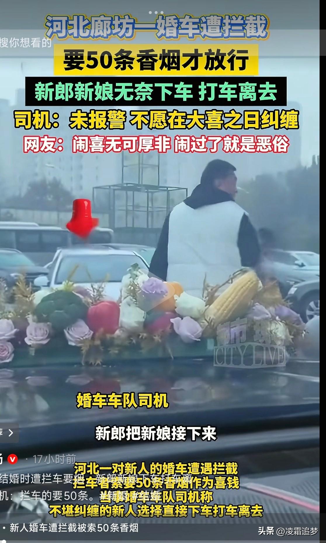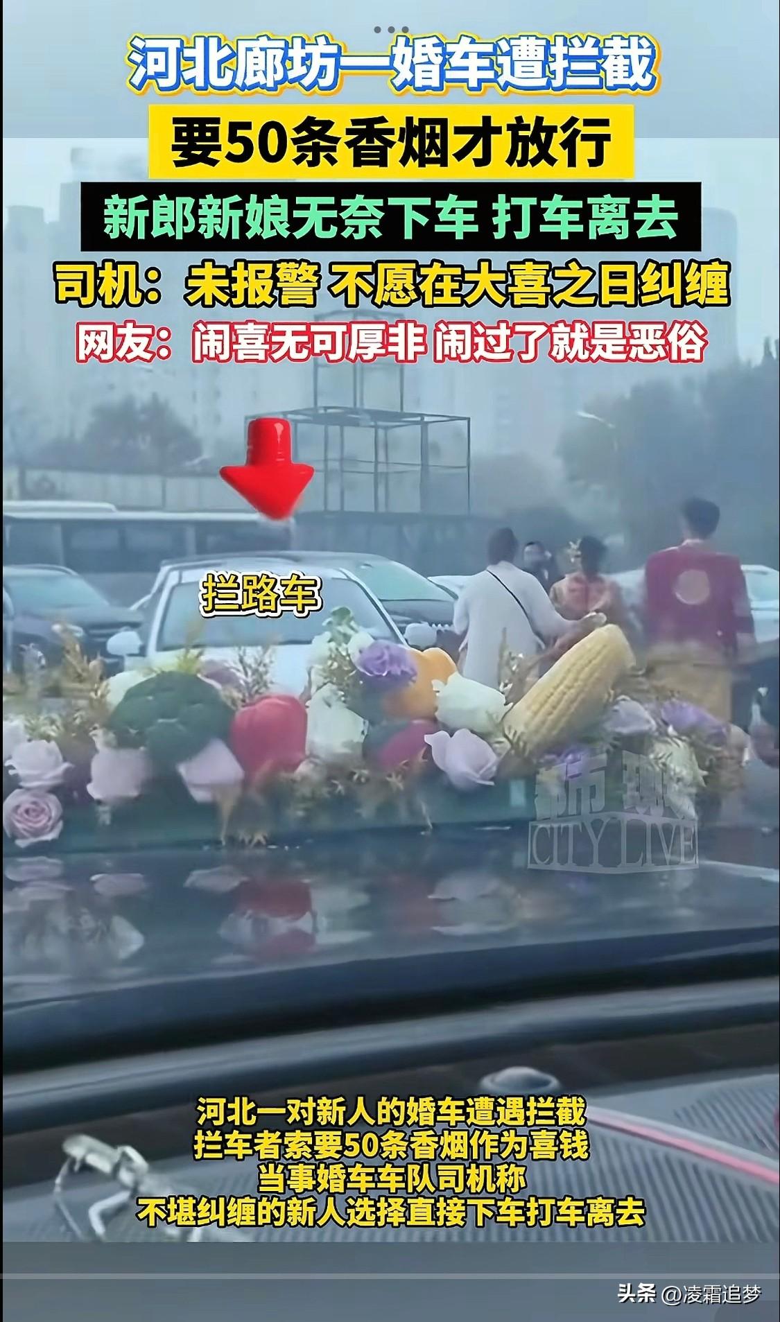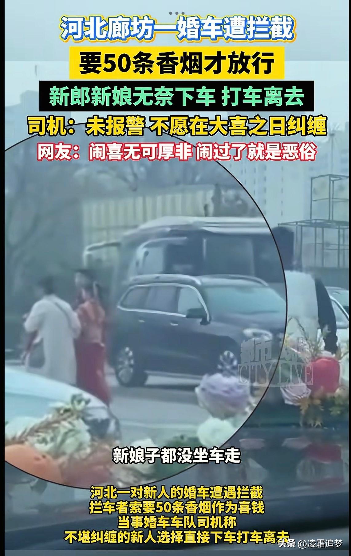 “太过分了!”河北廊坊,一对新人结婚乘坐婚车时,突然被两辆白车拦行要烟,夫妻俩没计较本想给一包烟图个吉利,结果对方竟然狮子大开口要50条烟!拉扯了近一个小时无果后,夫妻俩突然下车,一个决定让对方瞬间傻眼。网友怒怼:这哪里是讨喜,分明是拦路抢劫吧? 听说过结婚的时候拦路要烟的、要喜糖的、离谱一点还有要钱的,就是没听说过一下子要50条烟的!这算准了新人 大喜的日子不会翻脸吗? 根据都市现场11月5日报道,这件让人气愤又离谱的事,就发生在新郎接亲时。 亲友透露,当时白车车主拦下婚车后,嚣张的提出要50条烟作为喜钱,并且还一副“降低标准”的嘴脸说:“50条普通烟就行!”见夫妻不同意,这位要烟的男子又提出,没有50条也行,你给我10条贵烟! 夫妻俩不愿计较,可对方不达目的不肯罢休,一个劲的纠缠,见过要烟的,可谁也没见过一下子要这么多的,而且一副理直气壮的样子,气的婚车司机拿起电话就想报 警,却被新娘阻止了,理由是不想在大喜的日子纠缠。 双方差不多争论了一小时,新娘实在忍不了了,小夫妻像是约定好了,同时下了车,在对方诧异的表情里,打上了一辆出租车离开了。 要烟的男子当场傻眼了,这操作他闻所未闻,竟然会有人连婚车都不要了打车结婚,正主走了,剩下的婚车里坐的全是来道喜的亲朋好友,他根本没理由找别人要烟,最后只能不了了之的离开了。 视频一经发出,网友都炸了锅。 有网友愤怒道:这到底是什么风俗?活 不起了吗,人家大喜的日子趁火打劫添堵吗? 也有网友讽刺:这哪是要喜烟,这是批 发进货来了吧?认识的人闹闹就算了,不认识的人闹啥? 实话说,结婚是人一生中最 重要的日子,拦车讨喜烟喜糖图个热闹问题不大,但50条烟的要求实在太过分了,也太丢人了。 新人愿意给是情分,可有些人吃准了别人喜事上得寸进尺不会翻脸,就为所欲为。对付这种情况,不妥协也不纠缠,其实是最聪明的选择就是不理不睬。也希望这种风气能够引起重视,现在是文明社会,做人要有素质有底线。