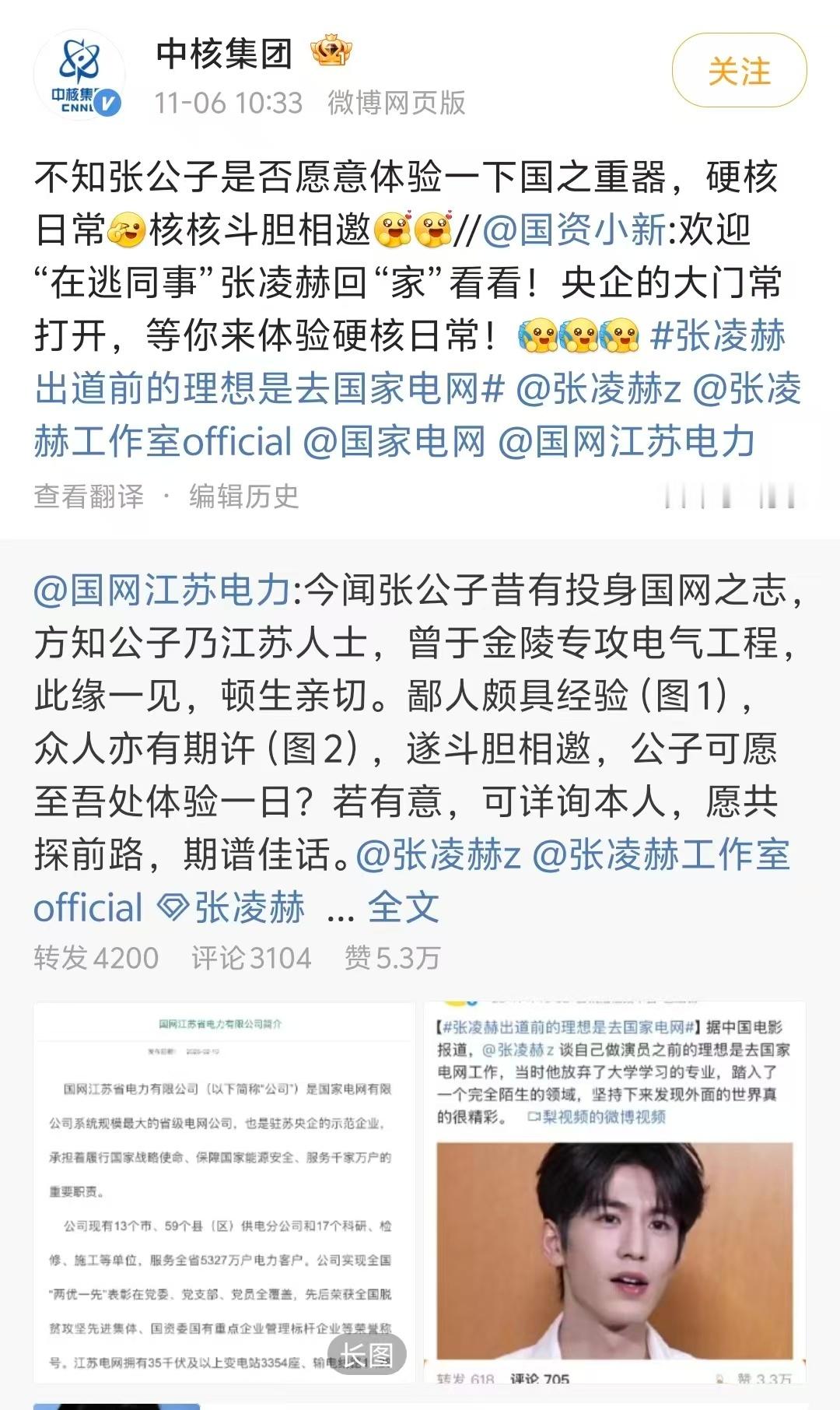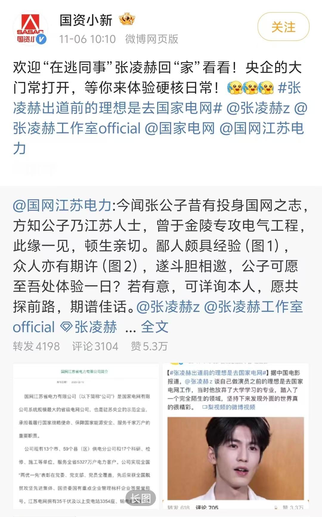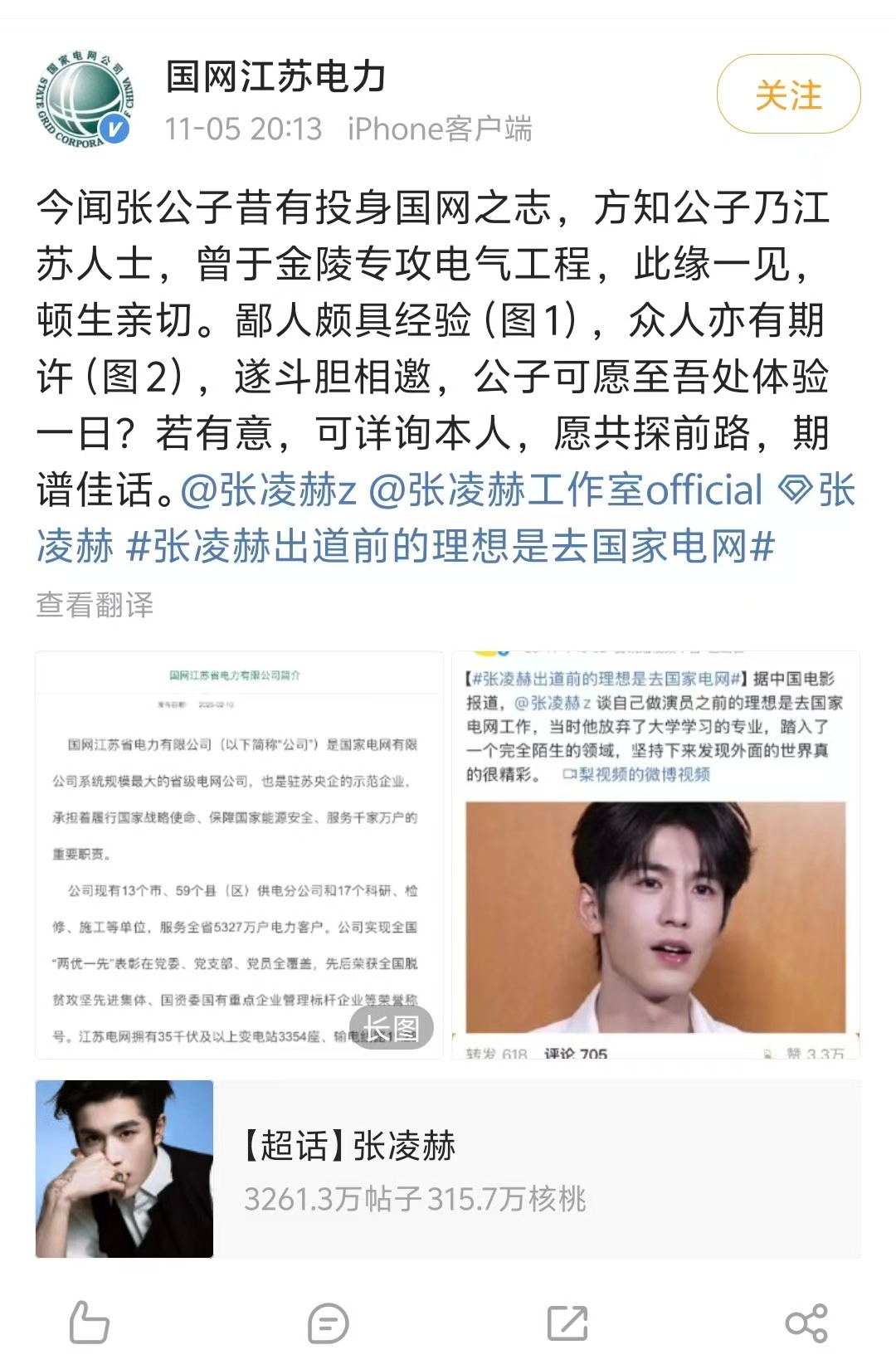 【江苏电网争抢张凌赫】张凌赫什么时候去巡回扫楼 好家伙,这个把变成古风小生了!最近,张凌赫在采访中说之前的理想是去国家电网工作,然后江苏电网就用文言文喊话:“今闻张公子昔有投身国网之志,曾于金陵专攻电气工程……遂斗胆相邀,公子可愿至吾处体验一日?”评论区的也开始发力:“公子乃无锡人士,何不至无锡?”“虽然能源分电力和石油,但梦想必!须!加!油!”所以张公子什么时候去巡回扫楼?[坏笑]