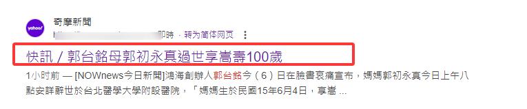 郭台铭100岁母亲去世了,这位老太太真的是享福了,不过她真的能够“返回故土”山东吗? 11月6号,郭台铭在自己的社交网上悲痛分享消息,他的母亲郭初永真去世。据了解,郭初永真是山东人,当年她与郭台铭父亲在青岛结婚,后来因为历史原因,才到了台湾省。 郭台铭创业期间,郭初永真帮了不少忙,所以郭台铭对母亲非常的感恩,这些年一直贴心照顾,有的时候甚至都不让给妻子曾馨莹,犹记得前些年住院的时候,他还亲自守护在医院外,这份孝心真的让人感慨不已。 不过郭初永真可能不会返回大陆安葬,毕竟他的家族本身有一个墓园,名叫“爱物园”,他的前妻以及弟弟都葬在这里,相信郭初永真也会葬在这个地方。