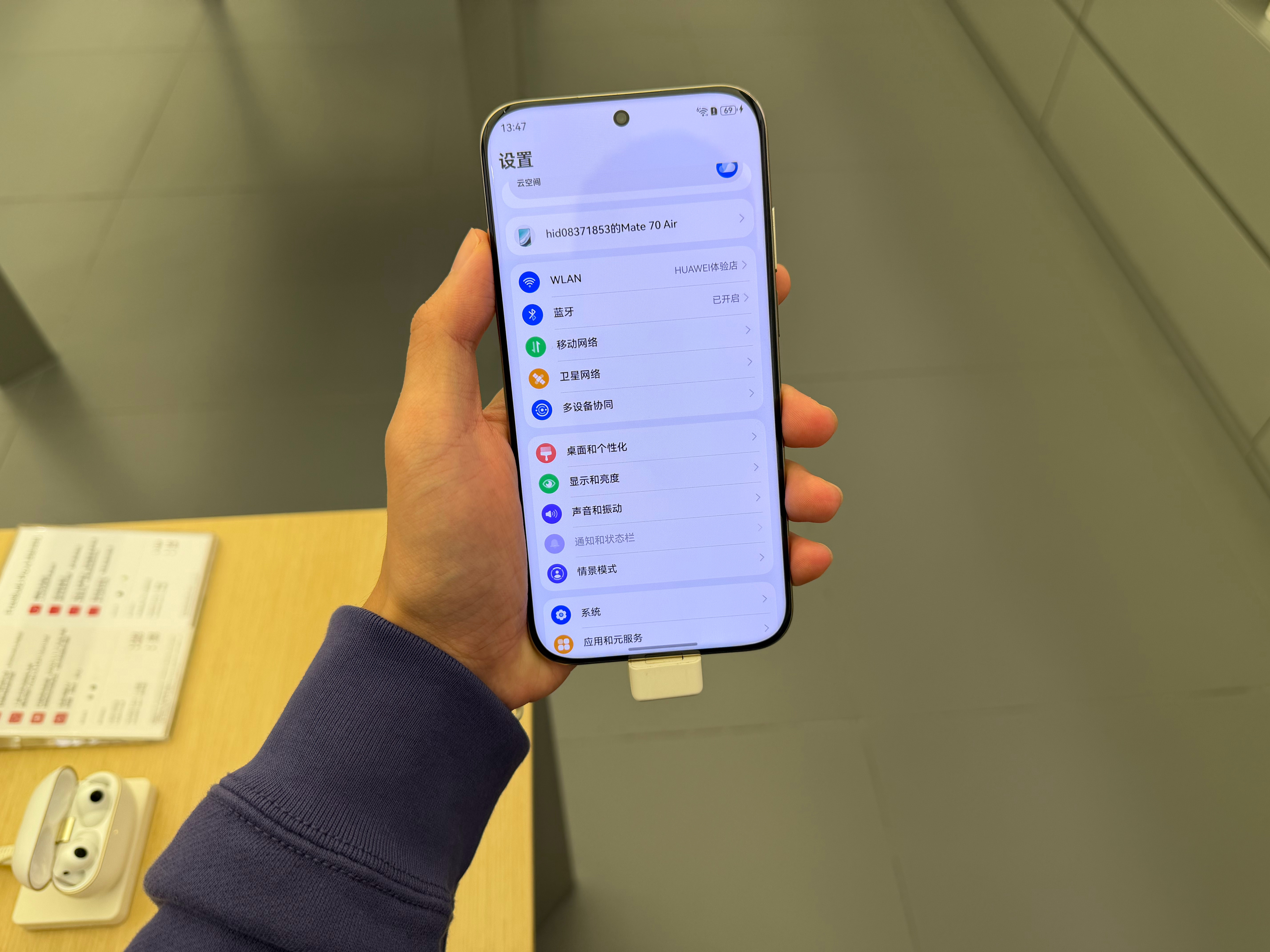 华为 Mate 70 Air 是一台没摸之前和摸过之后感受很不一样的手机,7 寸大屏重量分布均匀,机身很薄还有 6500mAh 电池,这个尺寸拿在手上 200g 出头我觉得并不重,依然坚持用大圆弧边框值得点赞,四微曲+圆弧边框就是我心目中最协调的设计,不过机身还是太宽了,我手小,单手玩有点吃力,屏幕很好,外放也不错,有长焦镜头,没有无线充电,它不是一台干掉 SIM 卡槽和多摄像头的“极致”Air,华为还是想做一款尽量兼顾基础体验且足够轻薄的 Air。华为mate70air