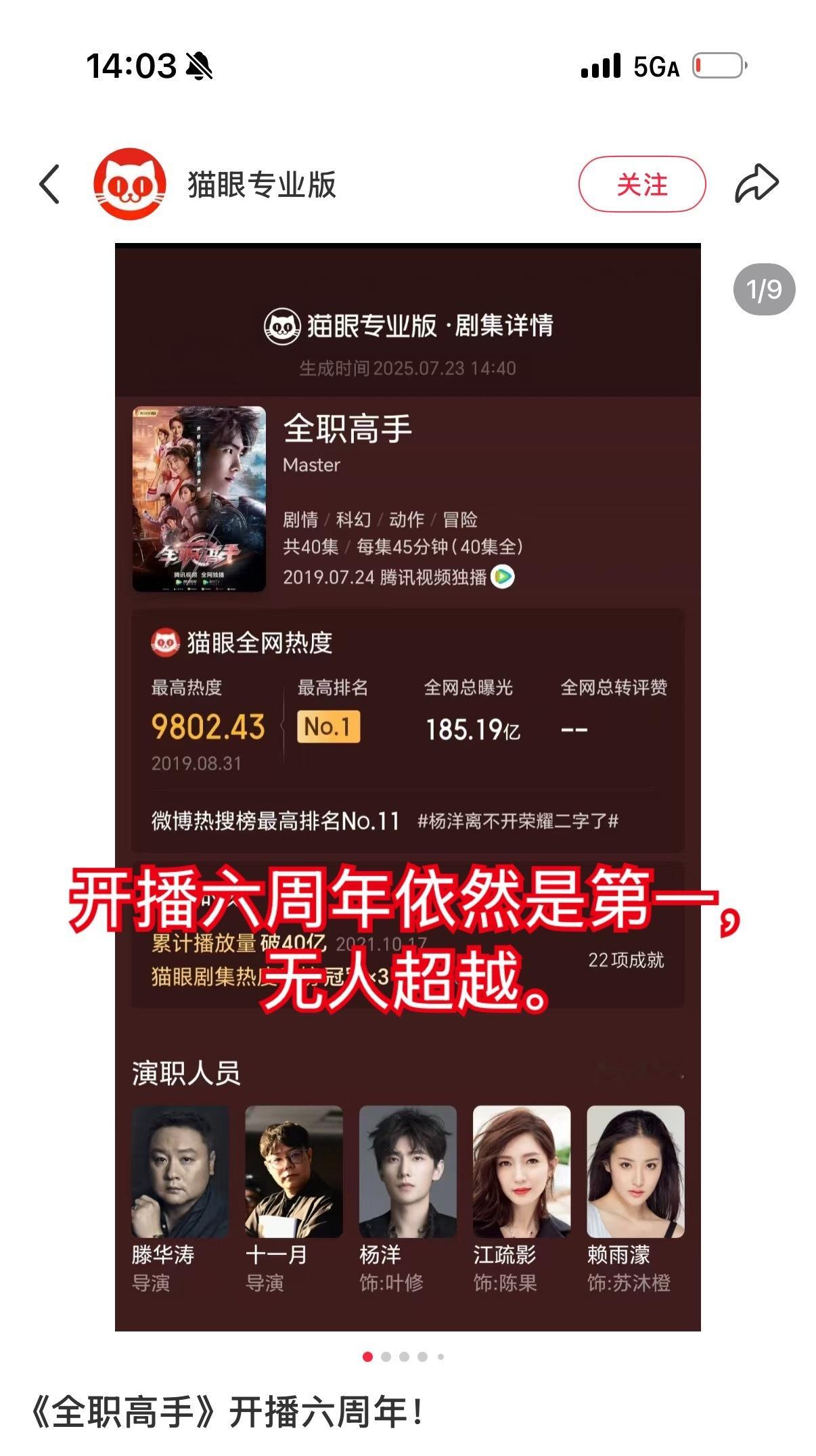 这部剧是我随便考古一下,就能被杨洋的扛剧实力震惊到的程度。在现存所有85-05生还沉浸在偶像剧麦麸剧里麦cp甚至还是素人的时候,🐑神已经开始单扛一番大男主了,统一一二三次元的审美,最赚钱的电视剧,自制招商第一名,海报是妥妥的C位,超超超超超长长尾效应。更牛逼的是《全职荣耀》只是开始,后面《特战荣耀》《你是我的荣耀》《我的人间烟火》《凡人修仙传》更是一部比一部🔥,一部比一部扛打。答应我,就这样一路牛逼的走下去