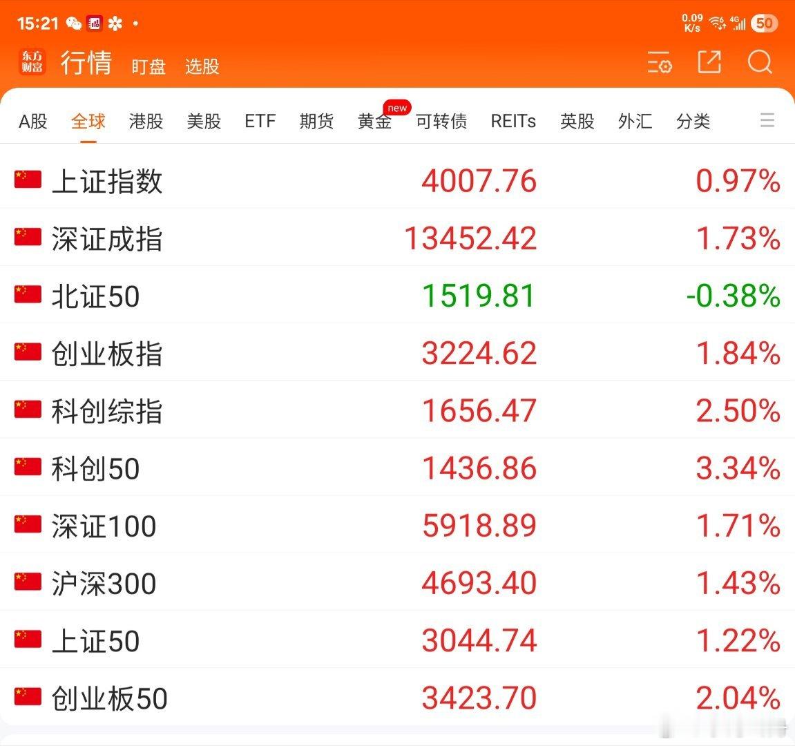 今天A股大盘走势不错: 东方财富App显示的10项指数除北证50稍跌以外,其他9项指数均上涨收红,上证指数涨0.97%至4007.76点,再次突破4000点关口,且科创综指、科创50和创业板50分别大涨2.50%、3.34%和2.04%。个股走势稍弱于昨天: 沪深京三交易所中,上涨的股票有2880支,比昨天少500支,其中涨幅在7%以上的有130支 ,比昨天多2支; 持平的股票有166支, 比昨天多17支; 下跌的股票有2388支,比昨天多483支,其中跌幅在7%以上的有39支,比昨多32支。三个市场全天的成交量为20762亿元,比昨天增量1817亿元, 再次站上2万亿元关口。今天A股成交量上升,科技股再次走强,或许会向上寻求新的突破[心][鲜花][耶][鲜花][心]