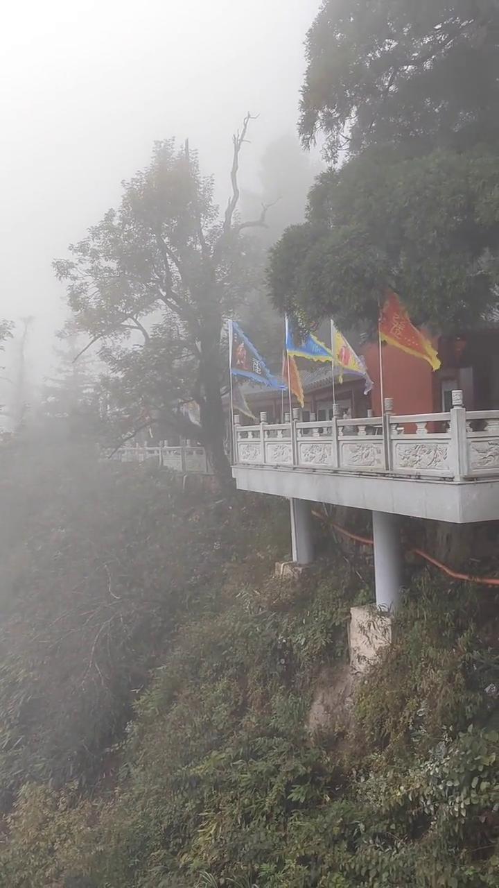 仙气飘飘。 看这个仙雾,飘上了葛山。这么多仙气,粘下仙气(哪里方言?)。一张拍一张,拍一张人间仙境图。这个寺庙香火跟人间烟火气融合在一起。我现在是在观道亭,正在移动,向左移动。这个顶上仙气飘飘,无人机在上面飞,应该拍到我了。 虽然仙气飘飘,但是其实高度也有边际效应。感觉到高到一定程度,高到几百米之后边际效应就递减了很多,那种感觉就逐渐钝化了。但是最初的时候对高度是比较敏感的。这山上也长了很多粽子叶,看来粽子叶的生命力还是蛮顽强的。你看这个云,这个山峰真正的是在云端之中。望仙谷,当然这里不是望仙谷,有望仙谷之类的。神仙居所都可以建在这种地方。